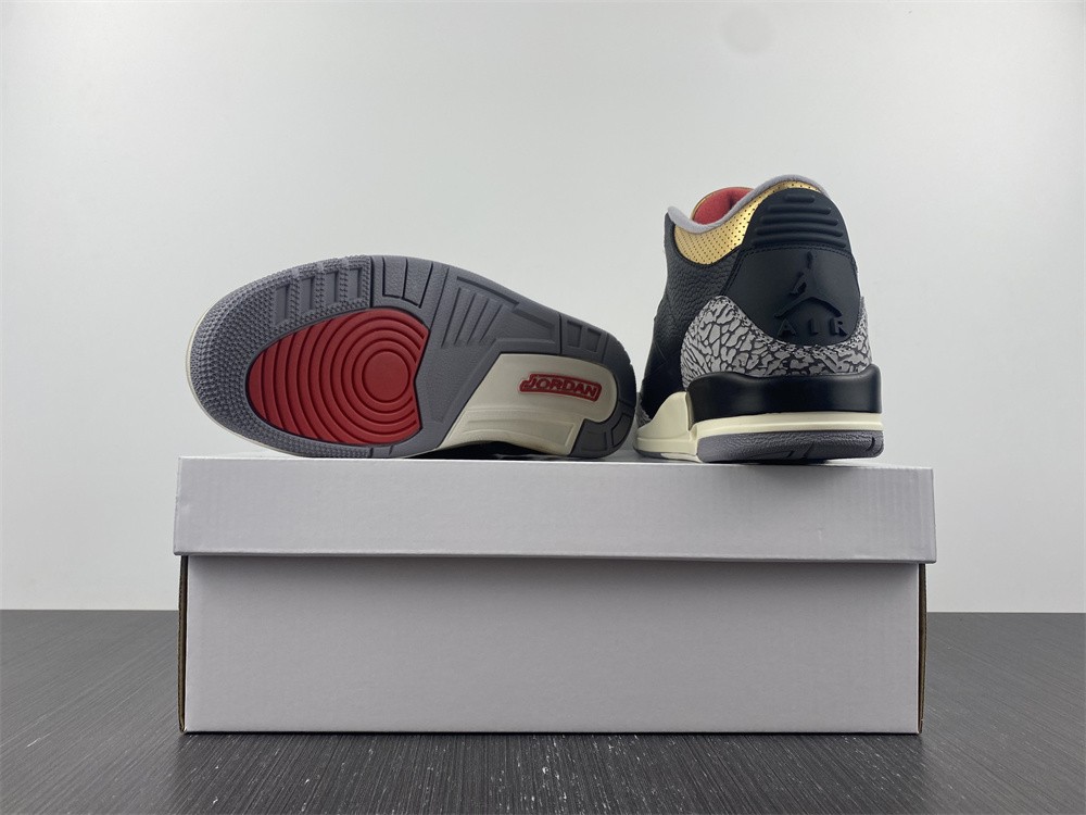 This Air Jordan version is similar to the "Black Cement" AJ3, adding metallic gold to the eyelet and ankle. Jumpman heel branding on a white midsole and grey rubber outsole completes the design.