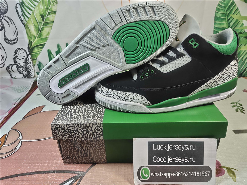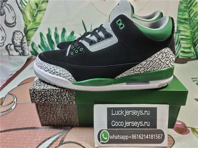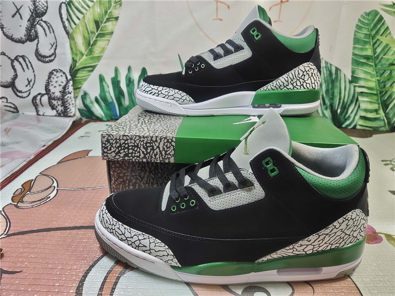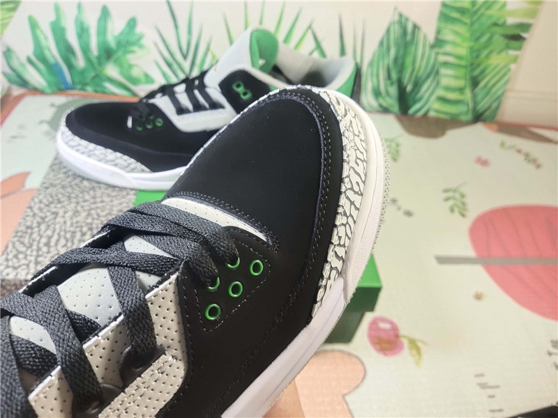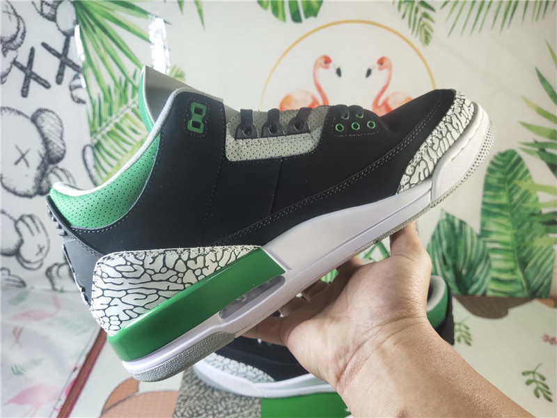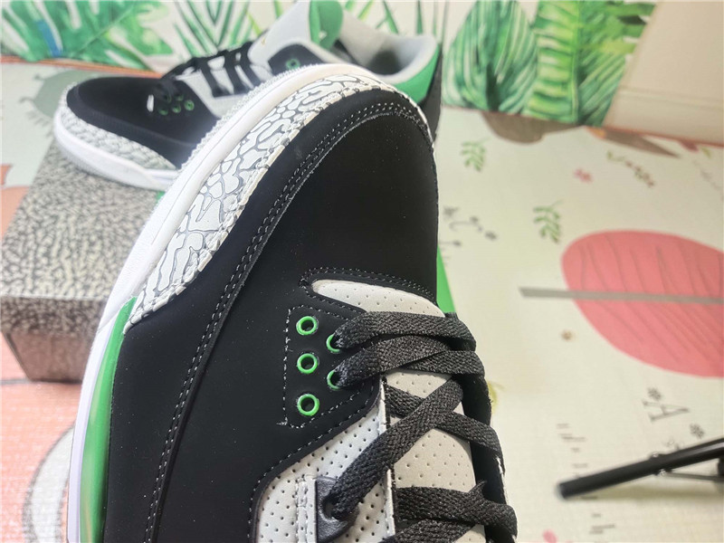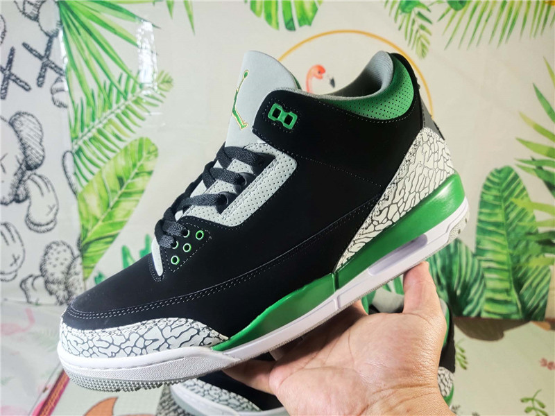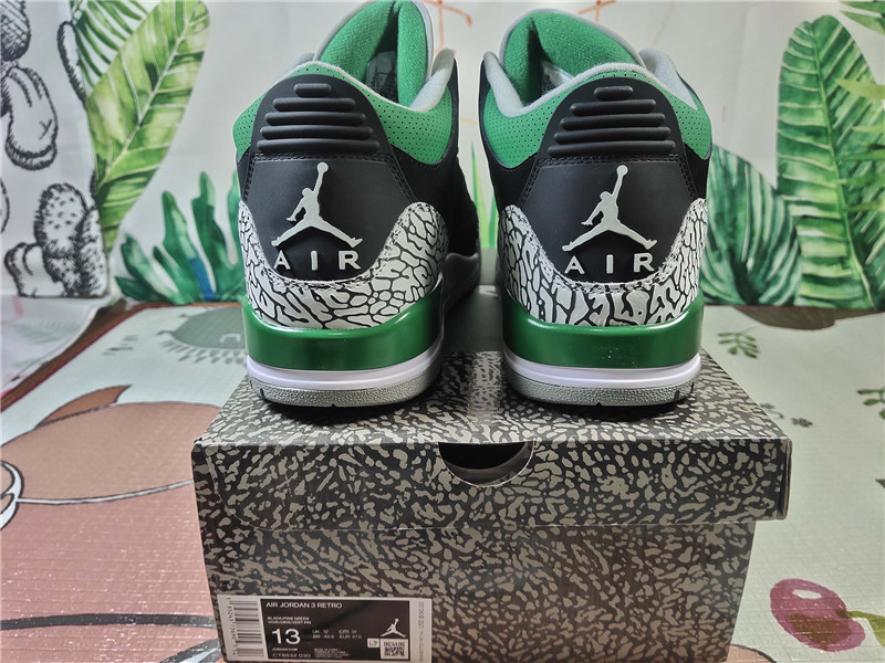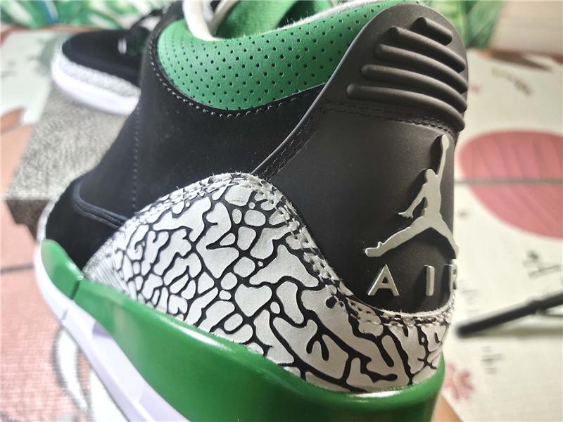 The Air Jordan 3 Retro ‘Pine Green’ combines OG-style color blocking with updated materials. Black textured nubuck replaces traditional leather construction on the upper, which is enlivened with verdant green accents on the molded eyelets, perforated leather collar, and embroidered Jumpman branding atop the tongue.