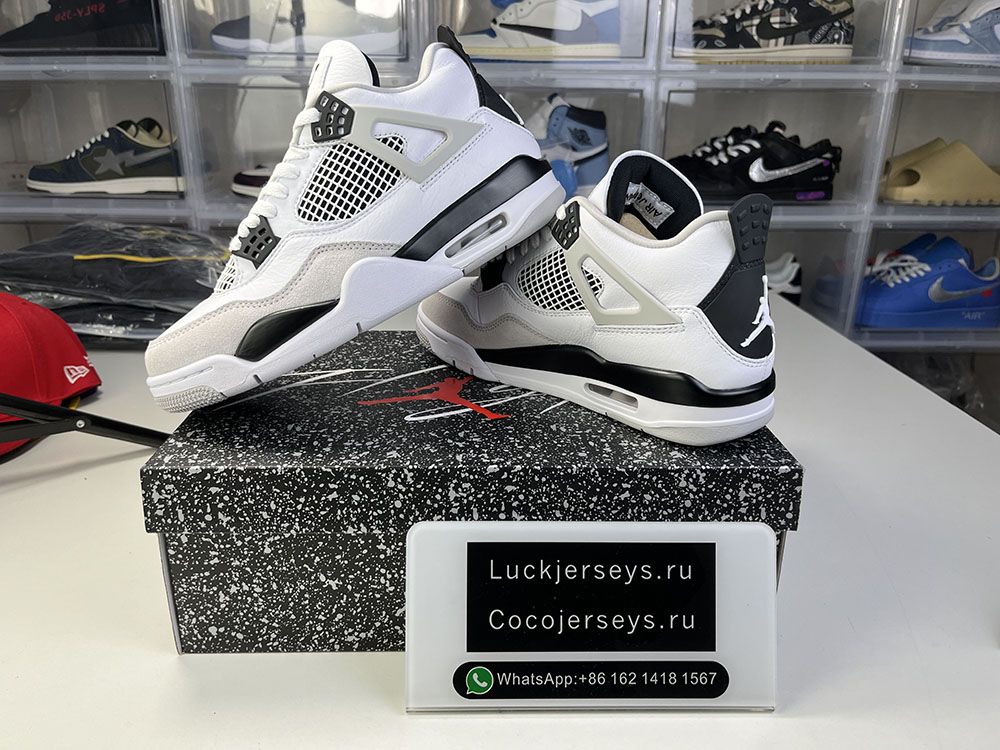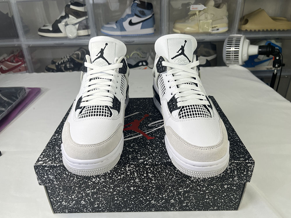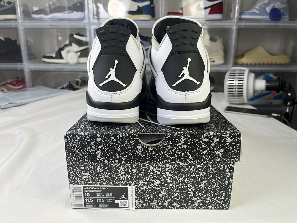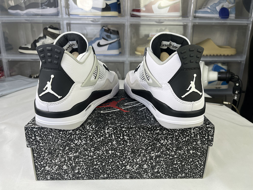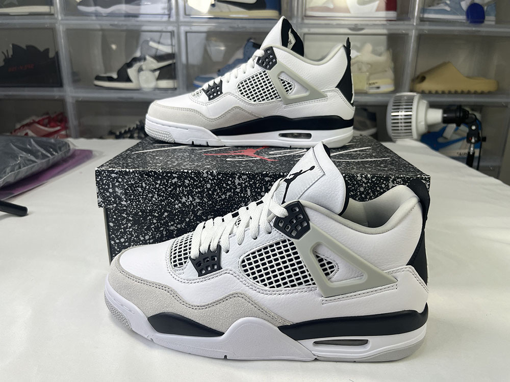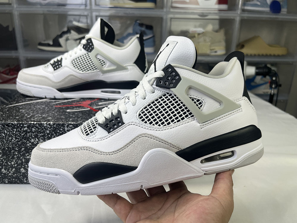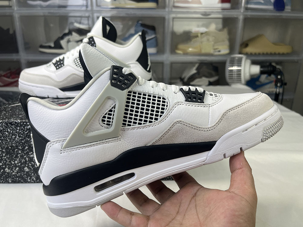 The shoes are in a similar hue to the Air Jordan 4 "Military Blue" color scheme, replacing all blue details with black, and the rest of the shoes will have a white leather upper and neutral gray overlay, and a white, black and gray splicing design will appear on the rubber outsole.
