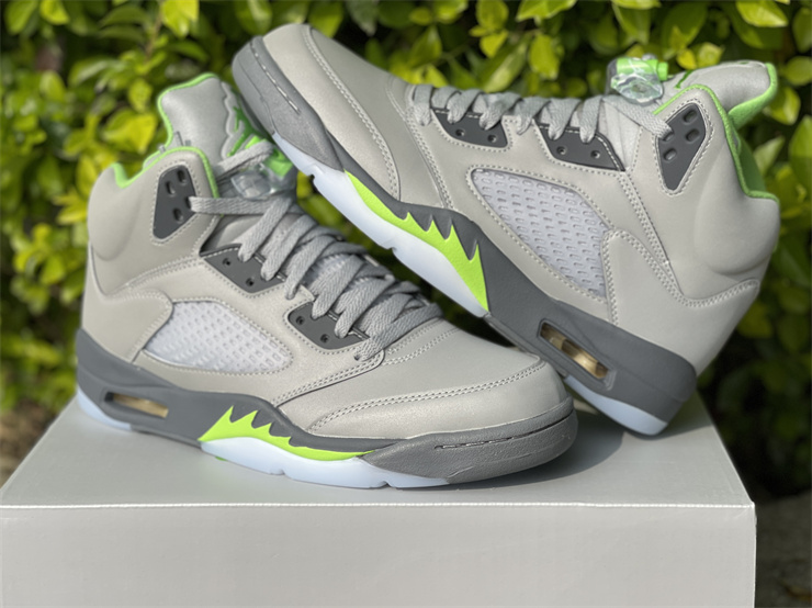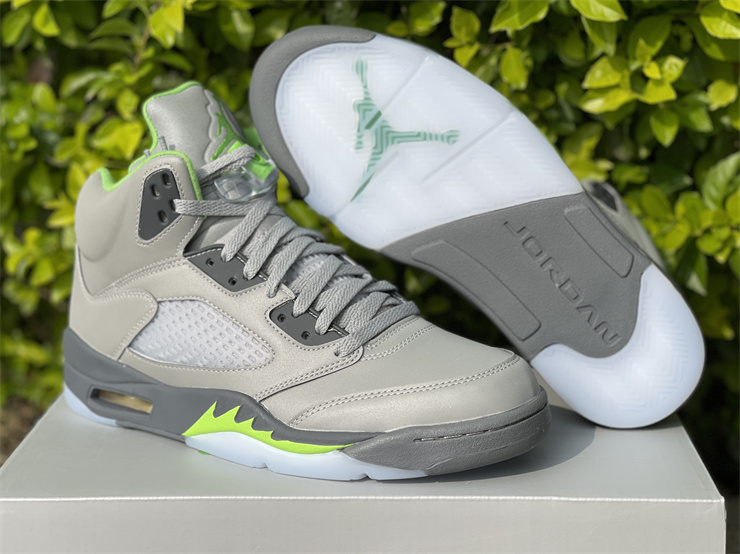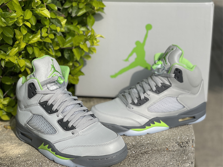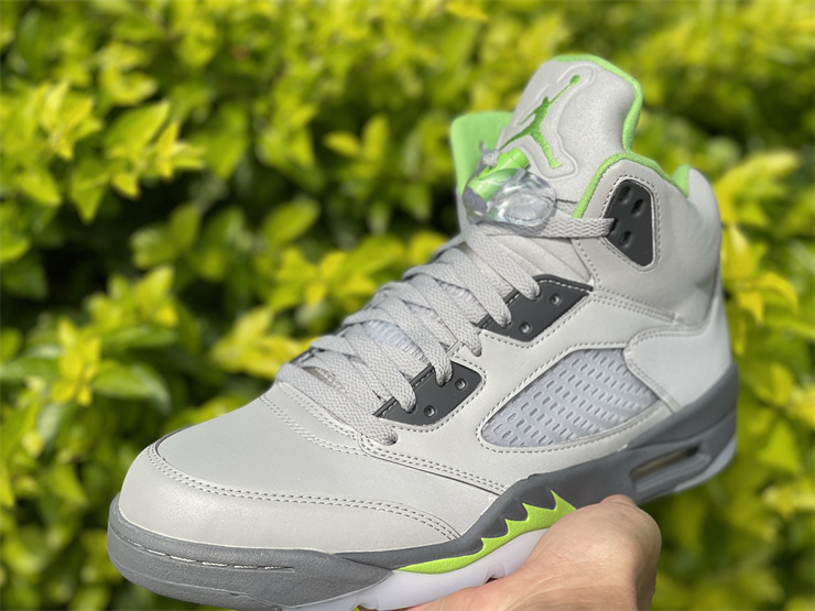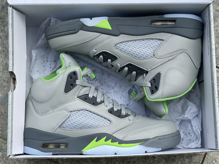 The upper of this pair of shoes is made of 3M reflective shoe material, which reflects light under the light. The midsole and lace holes are in dark grey. The tongue Jumpman Logo and the inner lining are fluorescent green, and the Jumpman Logo is printed on the inside of the shoe. Grey with green accents, and fluorescent green on the shark teeth on the shoe side. The crystal outsole has some oxidized Vibe style temperament, the outsole continues the transparent crystal shoe material of Air Jordan 5, and the heel is equipped with an external Air cushion.