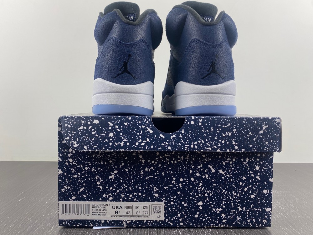 Tongue and heels on the Jumpman logo, translucent side mesh and logo lace locks. Midnight Navy suede upper, reminiscent of the Fear Jordan 5 with black perforations and lining, white midsole covered above with spotted shark teeth, covered over a cold translucent outsole.