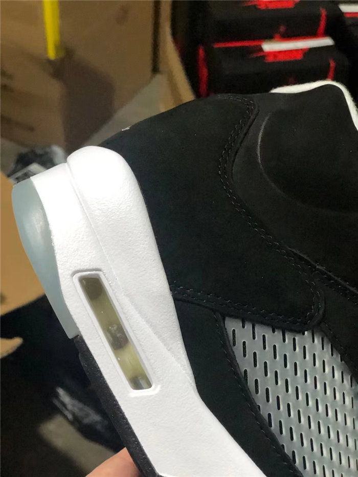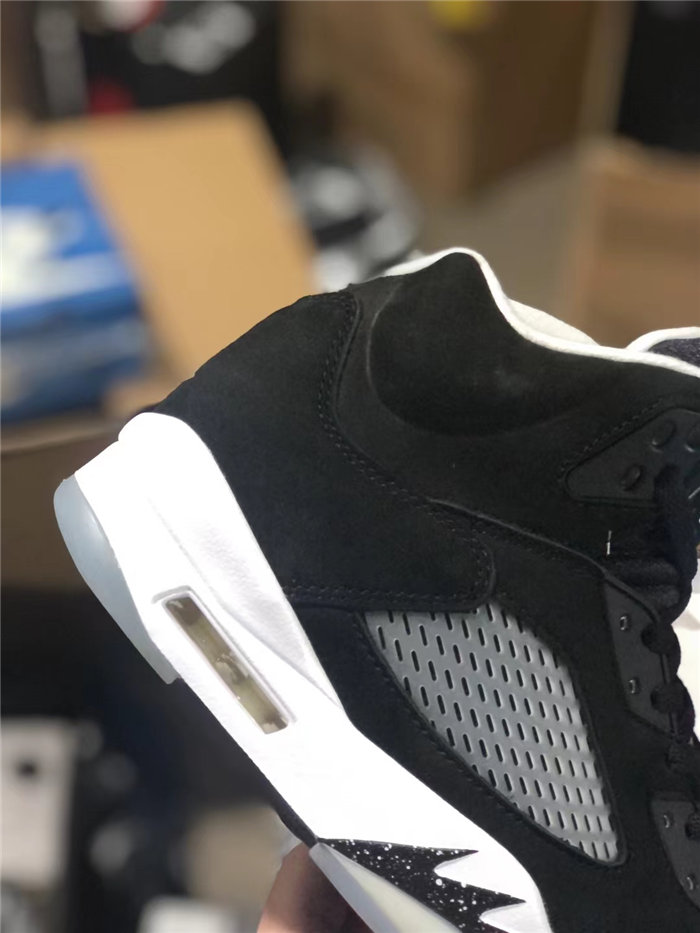 The mid-top sits on a white polyurethane midsole with a visible Air unit nestled in the heel and black shark-tooth detailing dusted in white speckles. Underfoot, an icy rubber outsole delivers stop-and-go traction.