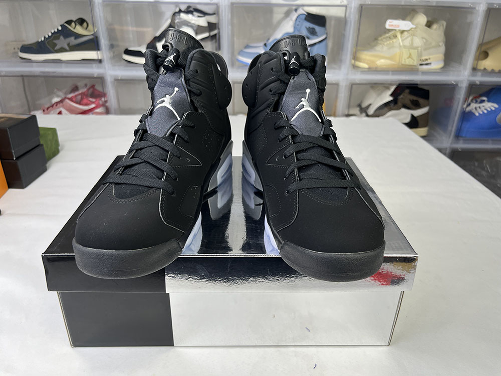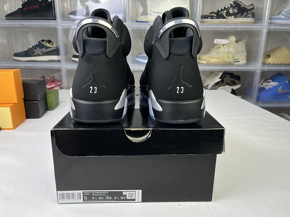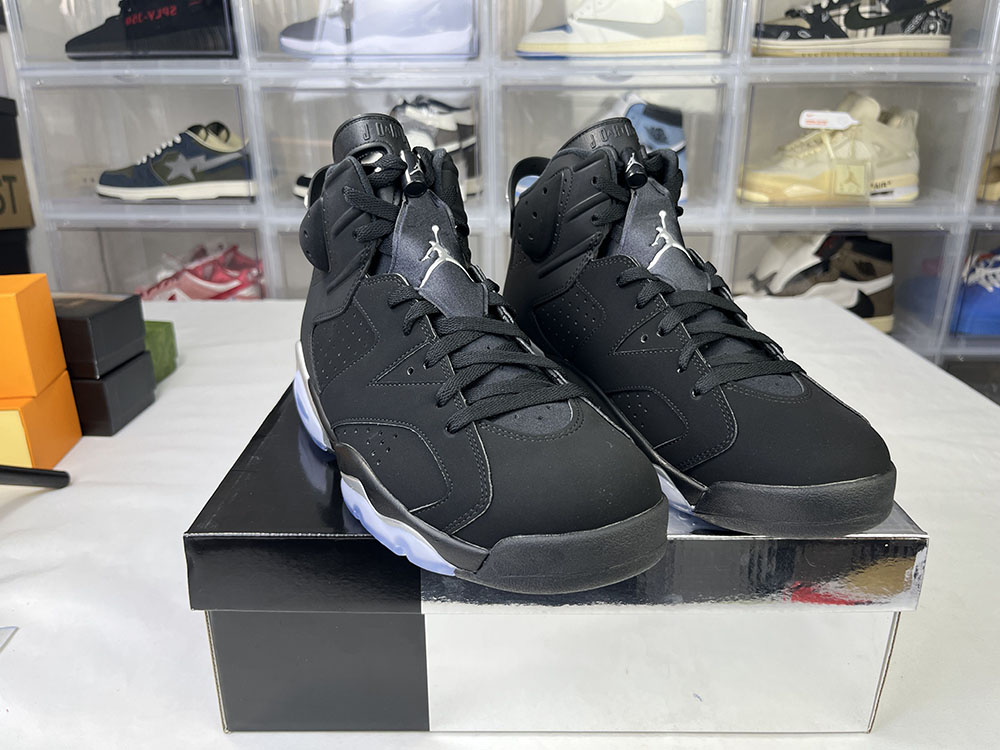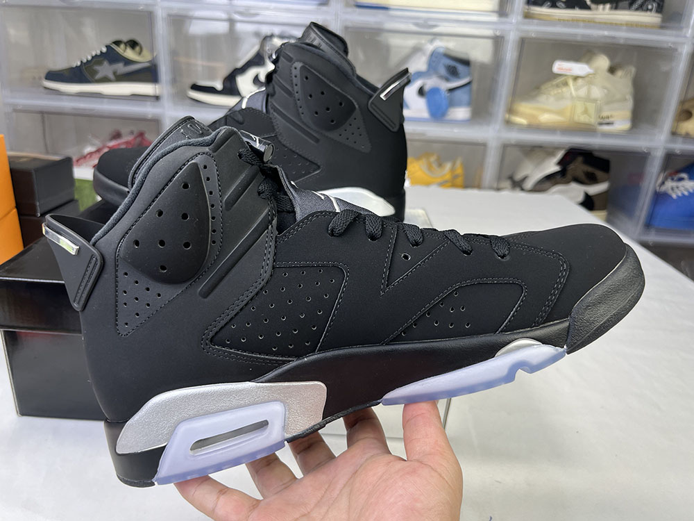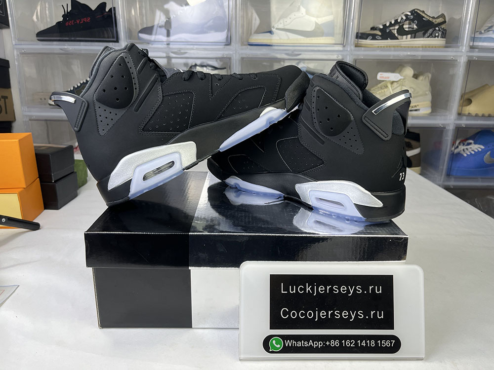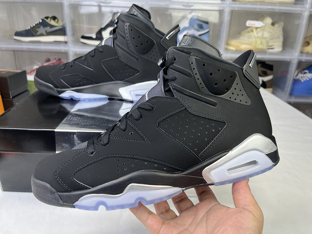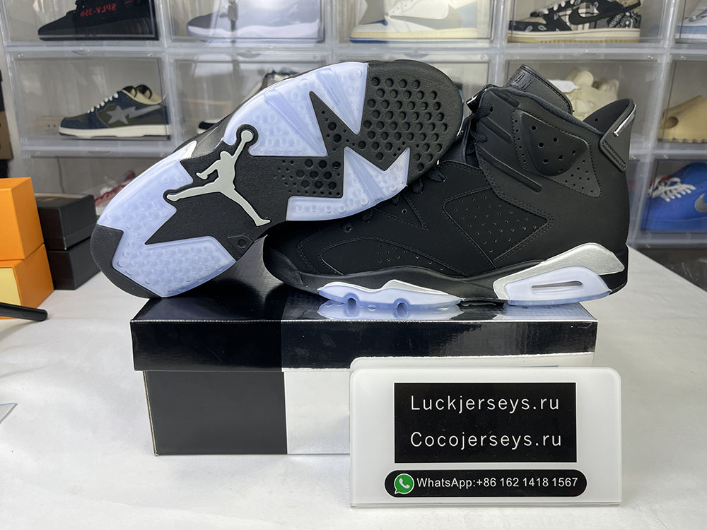The AJ6 sneakers feature a black matte upper with a translucent outsole, black and metallic silver, and other details in metallic silver.