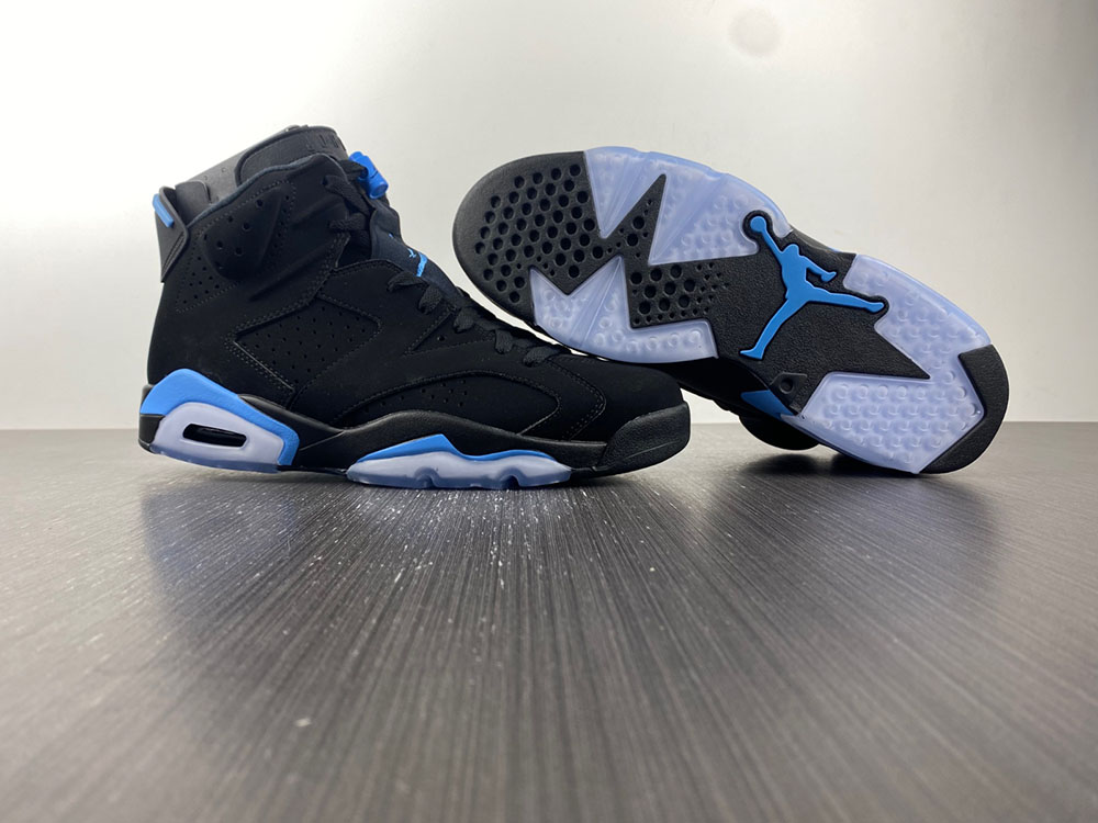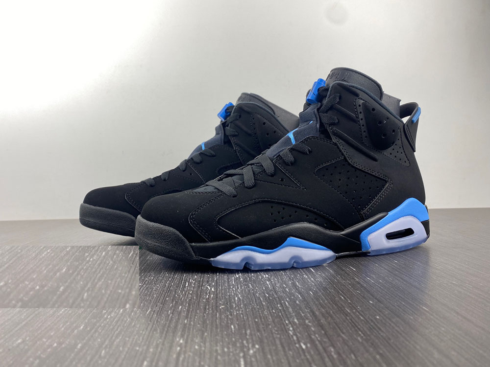 AJ6 Black and Red color matching Infrared infrared details are replaced with bright campus blue. The overall effect of black and white and blue color matching effects, black sumim leather shoe body.