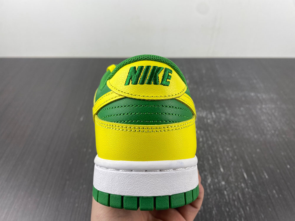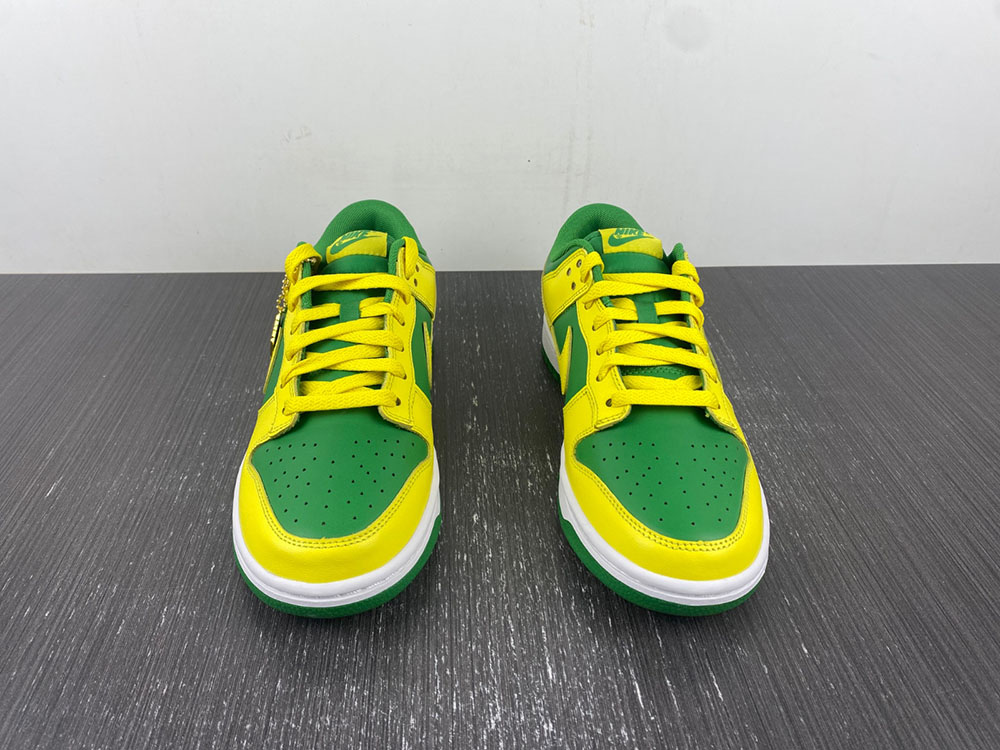 The body of the entire pair of shoes is yellow -green stitching. The white midsole with a green outsole end to improve the overall design.