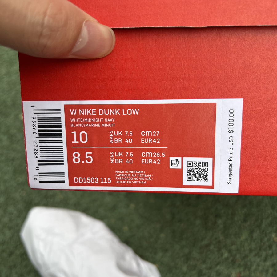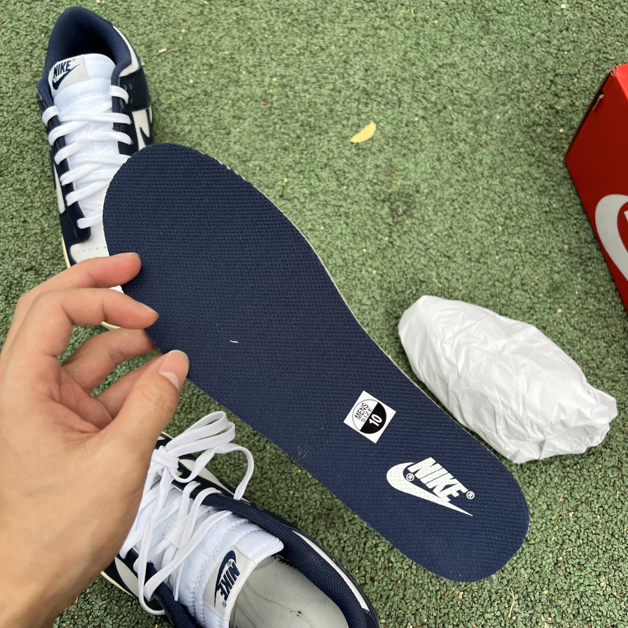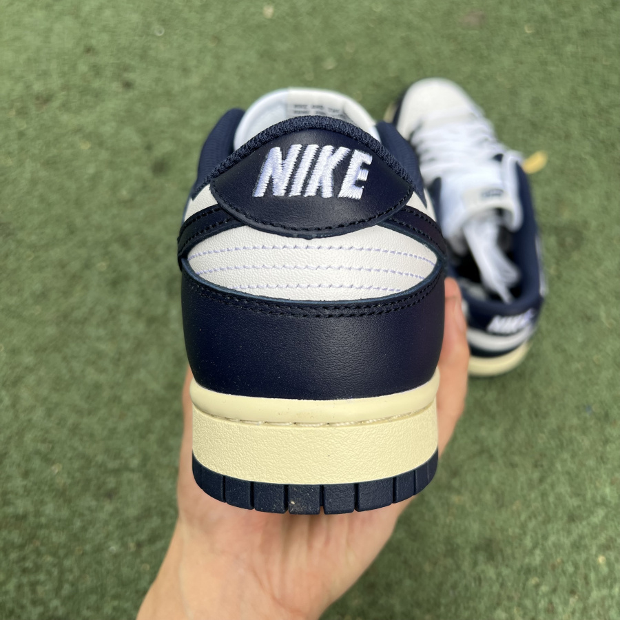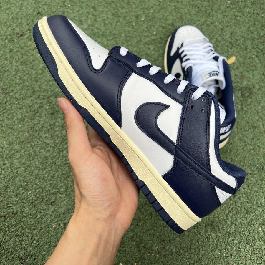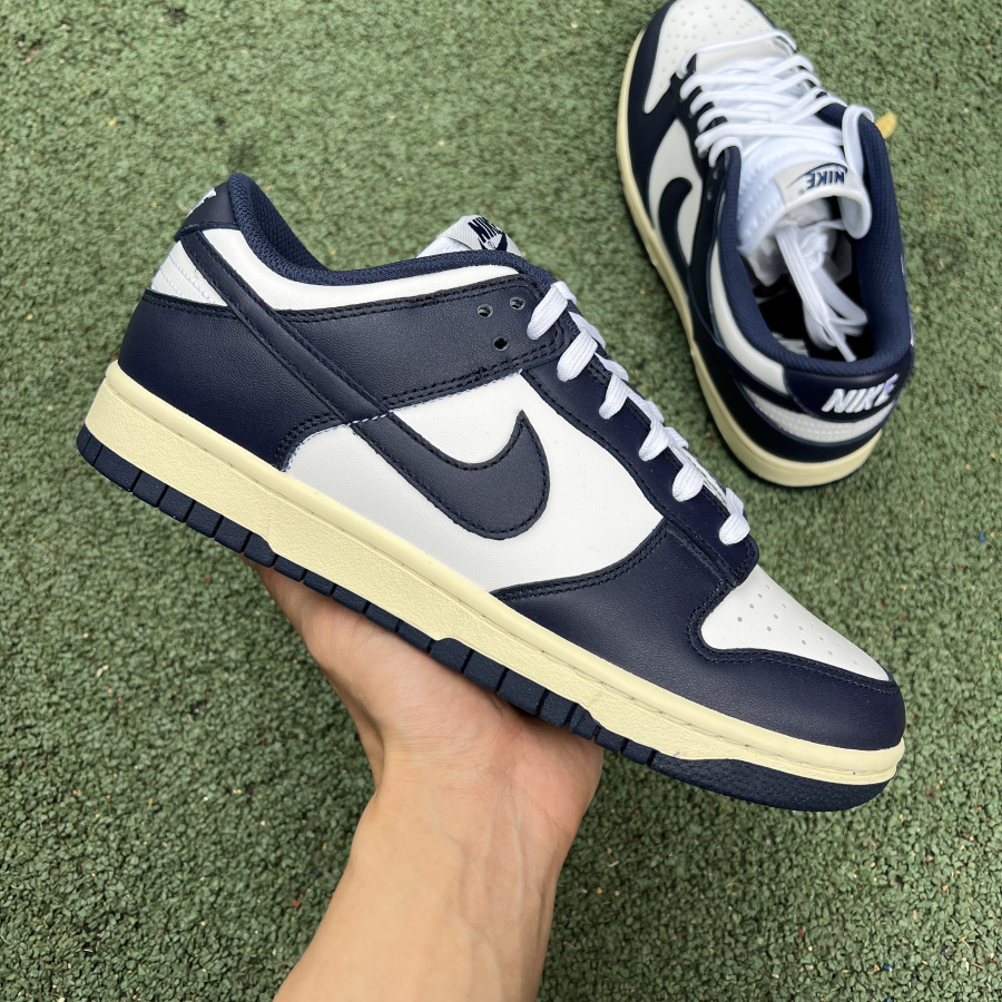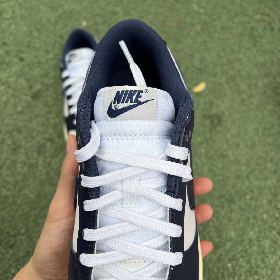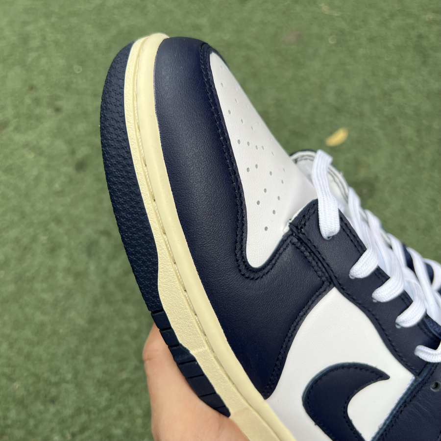 Nike Dunk Low Aged Navy Navy Blue White ️This colorway keeps the design simple and traditional, featuring a white leather sole with nylon tongue, laces and heel branding. Navy leather overlays, Swoosh, lining, outsole, tongue and insole branding sit on the aged yellow midsole, completing the design.