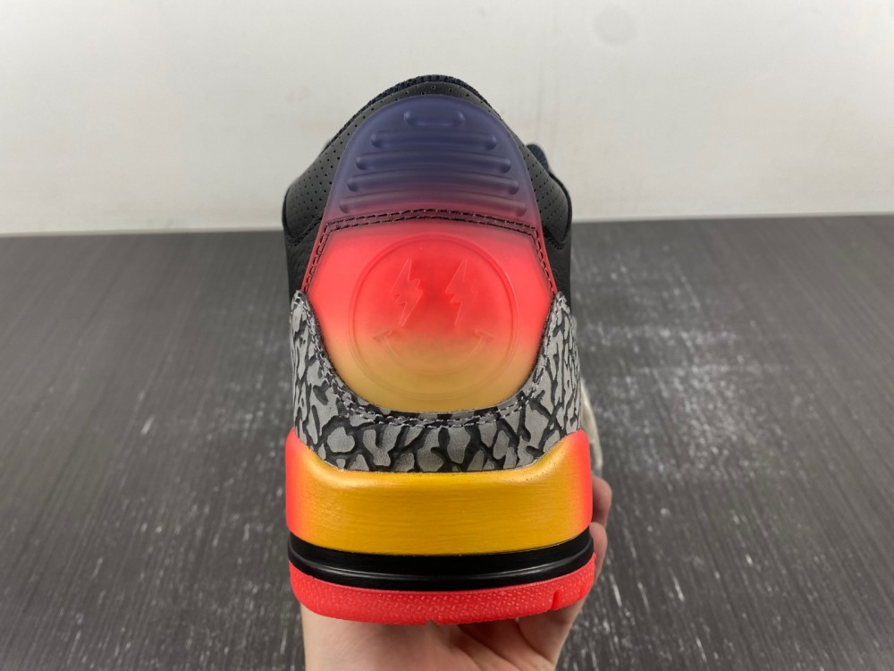 Air and JBalvin's lightning-smiley Logo, and the cuts in the upper leather are specially filled in black. The Jumpman Logo is embellished on the black tongue, injecting striking vitality and recognition, and the colorful gradient color is presented.