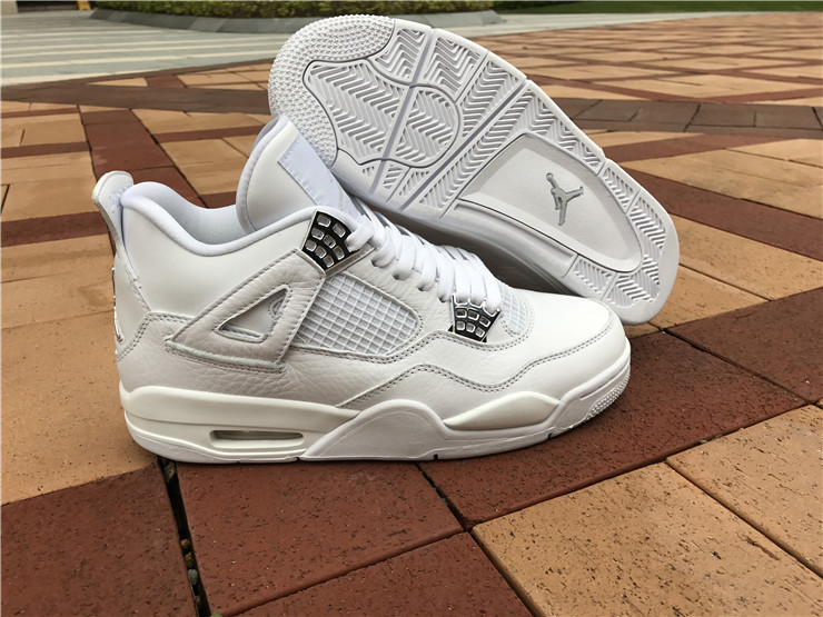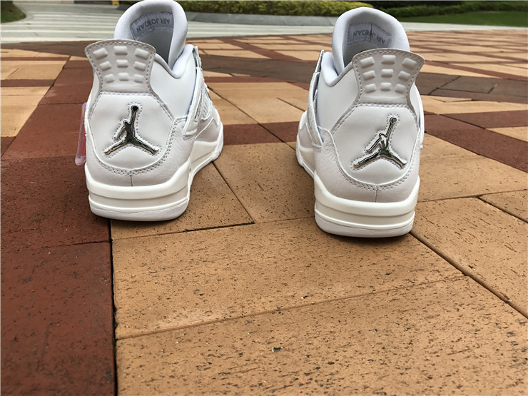 All white shoes with silver metallic Jumpman Logo and lace buckle, simple yet luxurious.