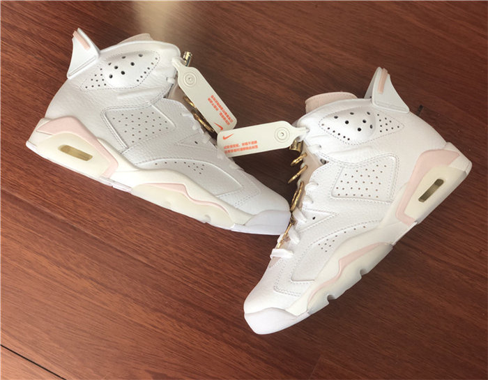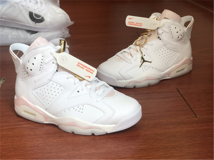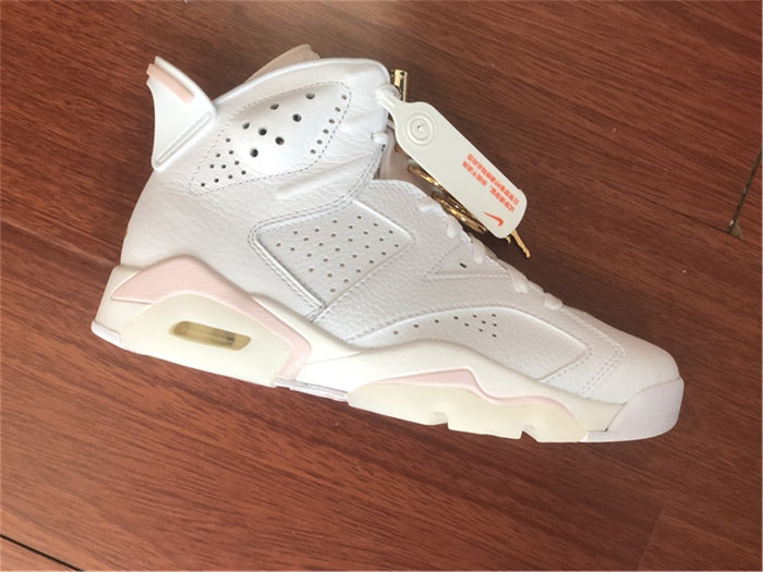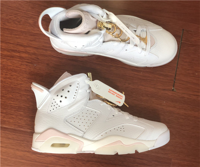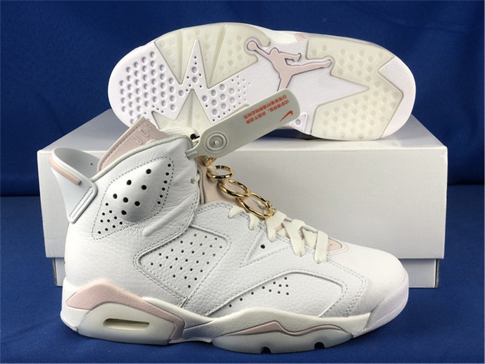 The vintage mid-top carries a white tumbled leather upper with Barely Rose hits on the tongue, heel tab and midsole, fitted with a visible Air-sole unit in the heel. Metallic gold lace locks are matched by a trio of earring-inspired gold hoops, with a Jumpman charm attached to the lowest ring via a short gold chain. Underfoot, milky translucent rubber is utilized on the outsole.