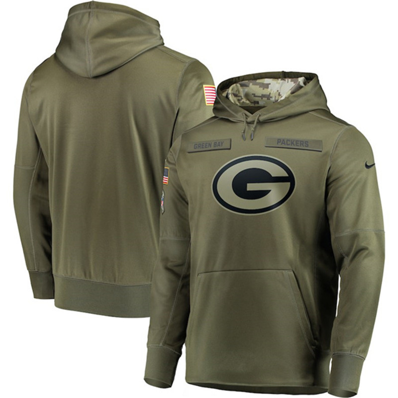 Men's Green Bay Packers 2018 Olive Salute to Service Sideline Therma Performance Pullover Stitched NFL Hoodie
