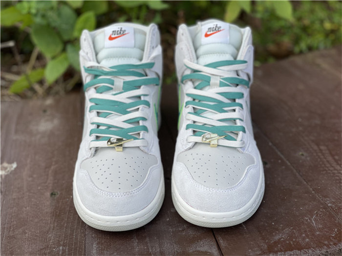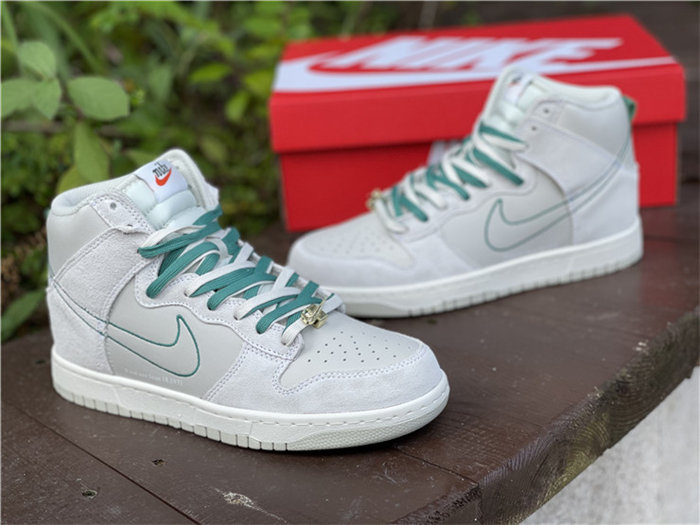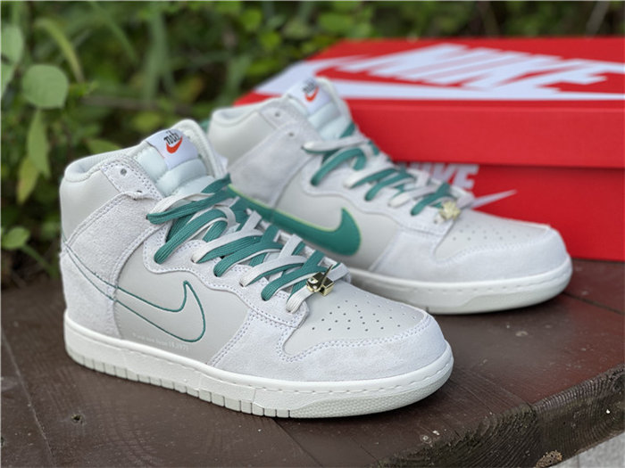 The Nike Dunk High SE ‘Green Noise’ is taken from the ‘First Use Pack,’ celebrating the 50th anniversary of the Swoosh logo. The high-top makes use of an off-white leather upper with tonal suede overlays and a green leather Swoosh on the medial side.