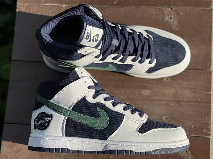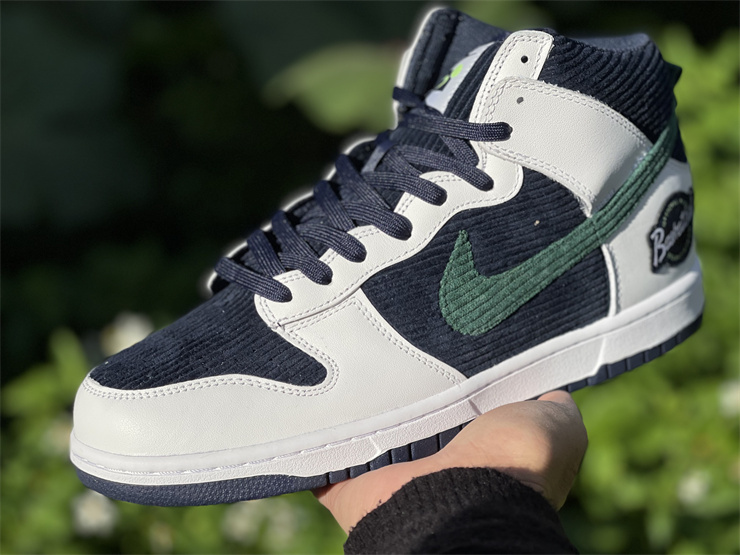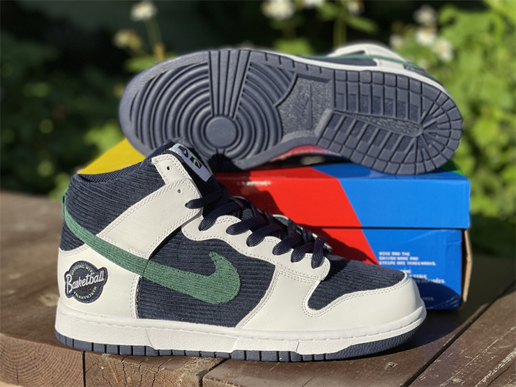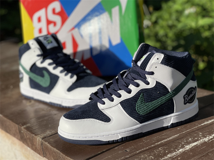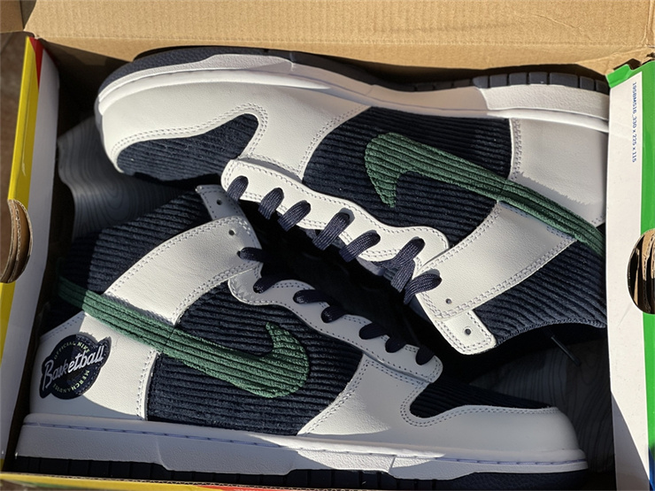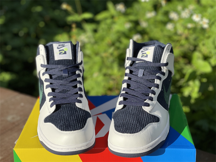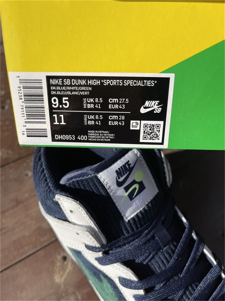 This Nike Dunk High "Sports Specialties" is a tribute to its Sports Specialties cap series. This pair of shoes is made of white leather as a base, with azure and grass green striped suede, showing the striped texture commonly used in hats. The tongue and insole are decorated with the exclusive Logo of the Sports Specialties hat series, and marked on the heel. The words "Nike Basketball Official Merchandise".