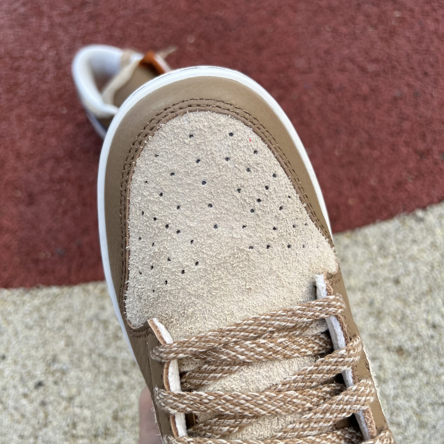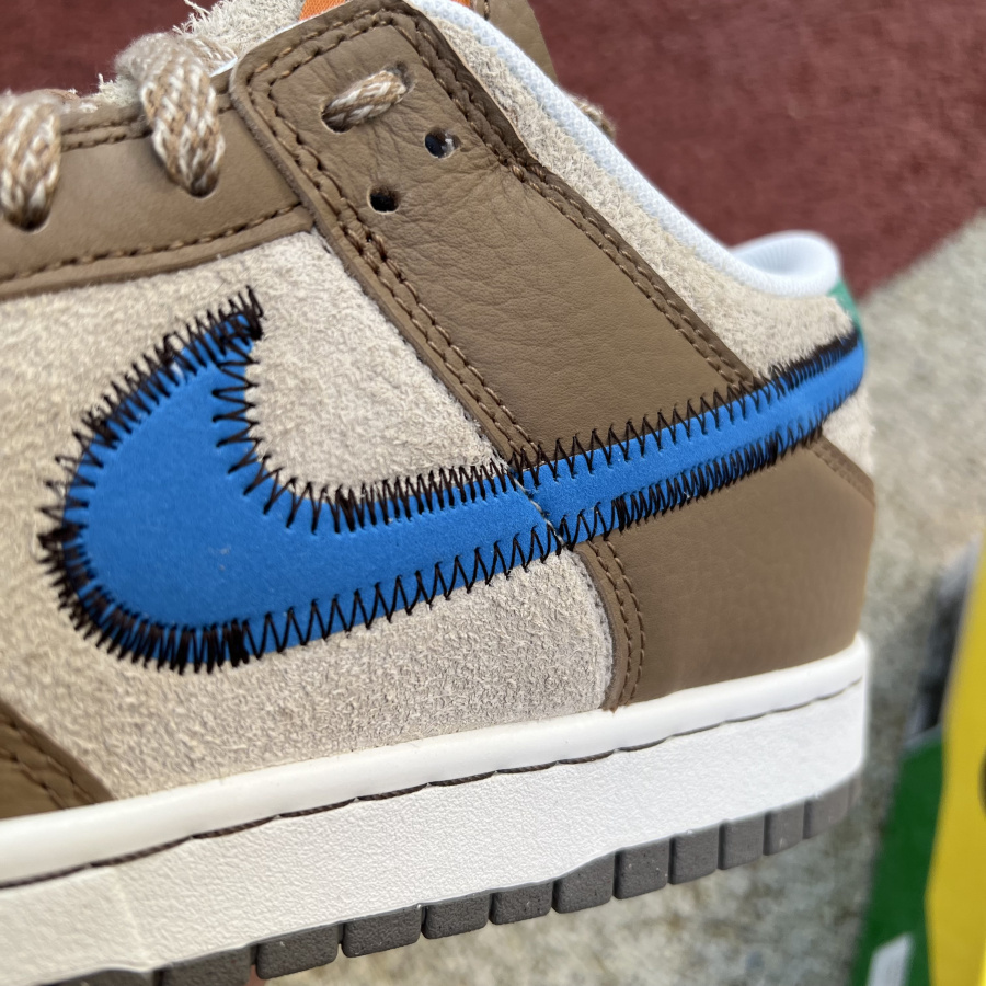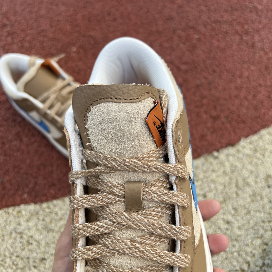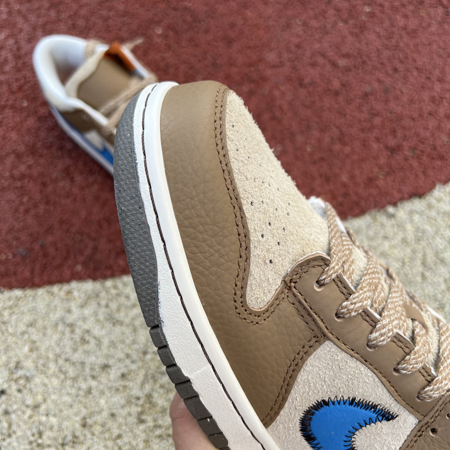 Crafted in brown leather and suede, this one features a blue Swoosh at the sides and black stitching for an outline. The orange Nike label on the tongue is reversed.