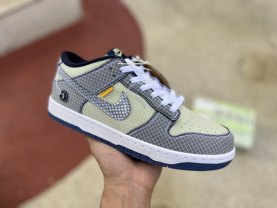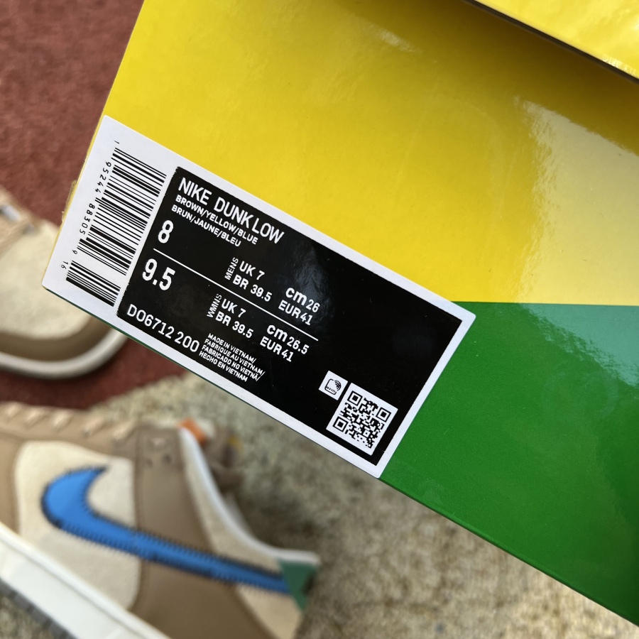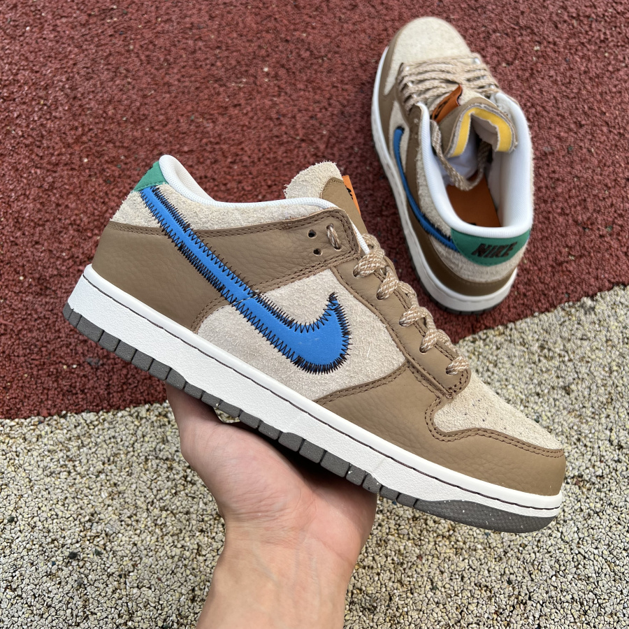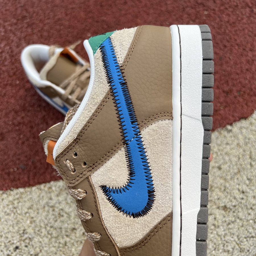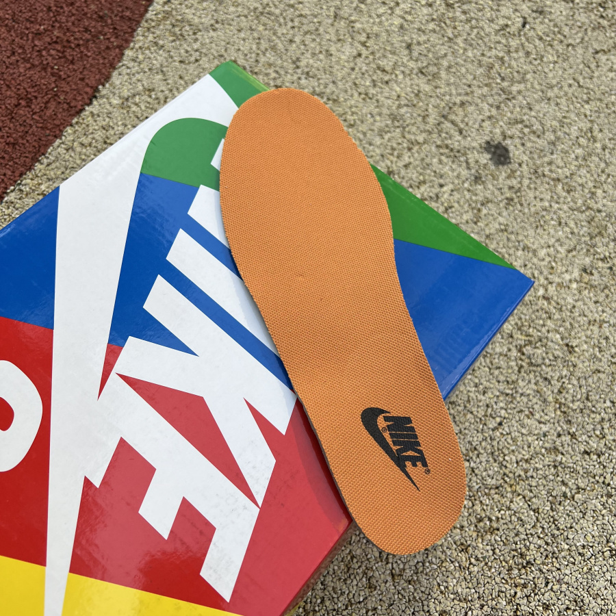 Crafted in brown leather and suede, this one features a blue Swoosh at the sides and black stitching for an outline. The orange Nike label on the tongue is reversed.