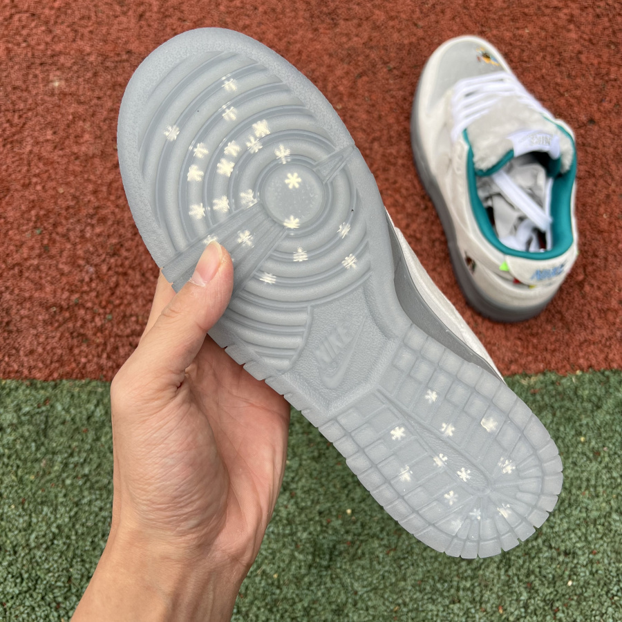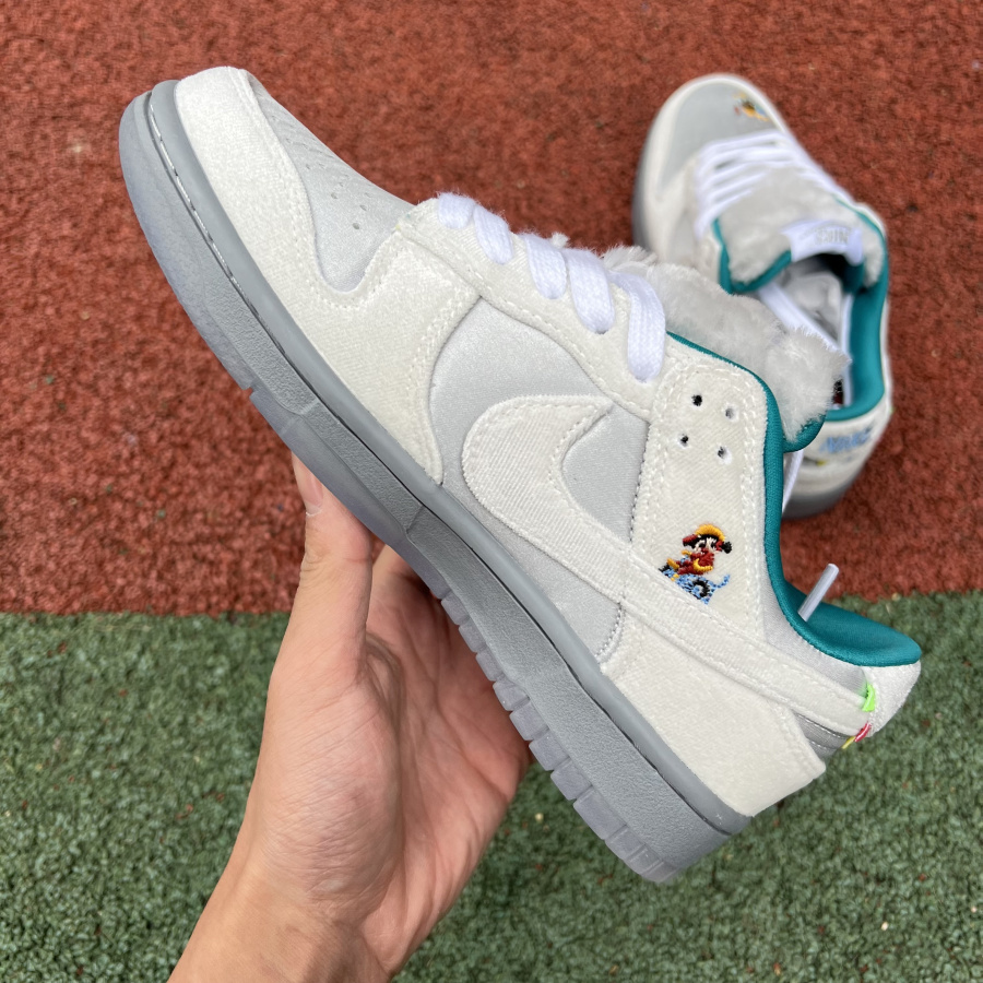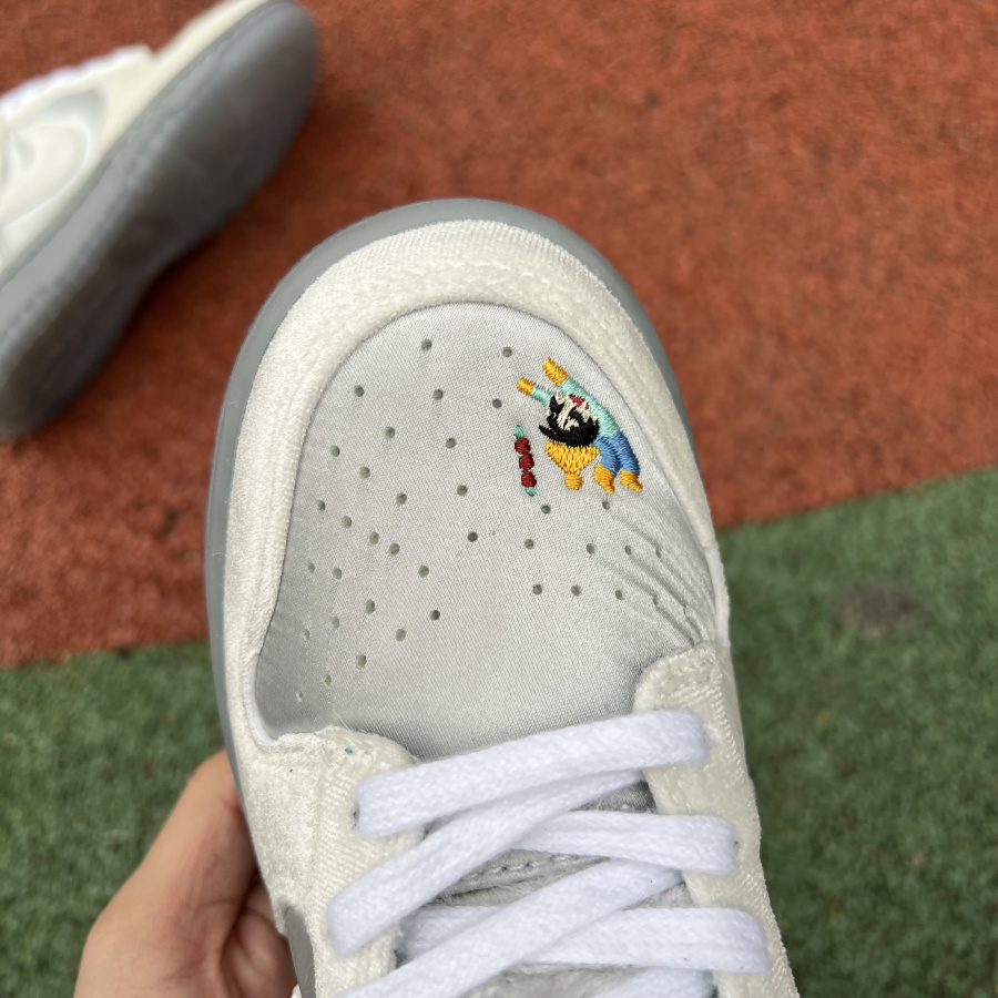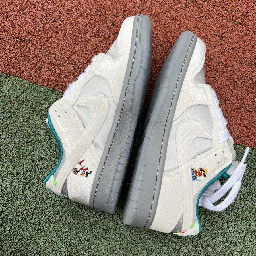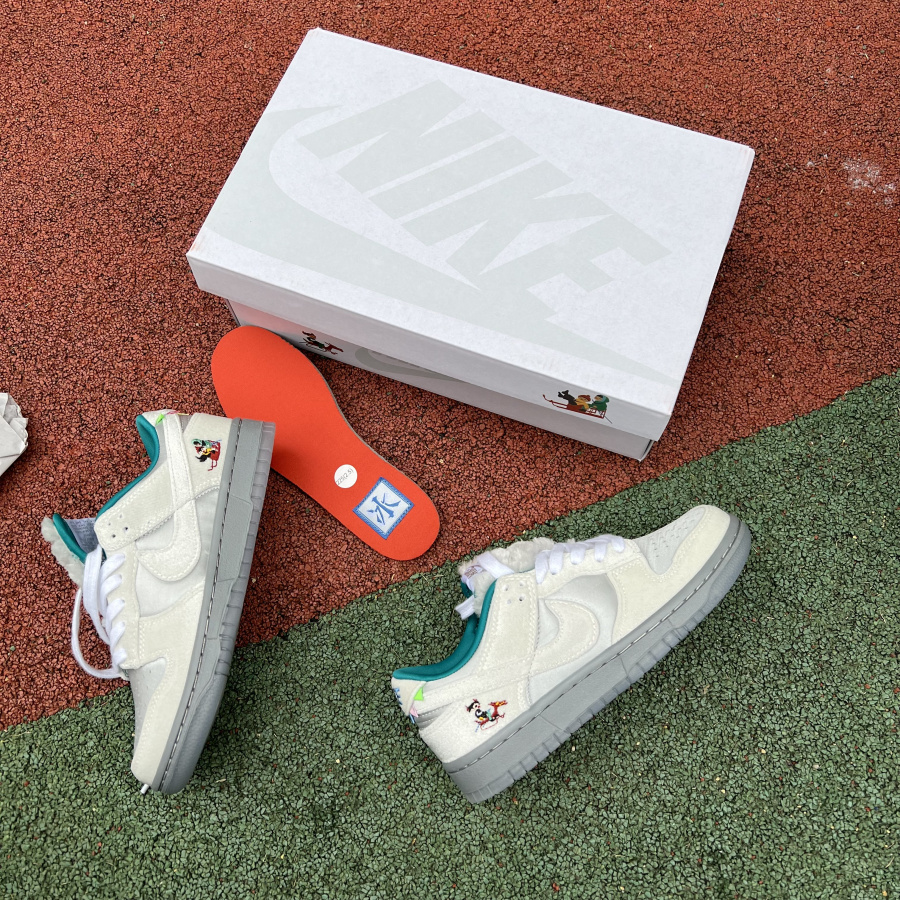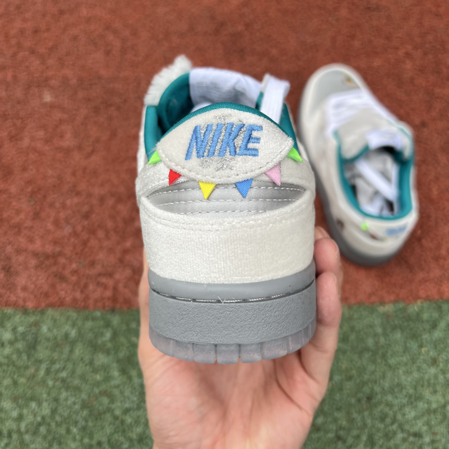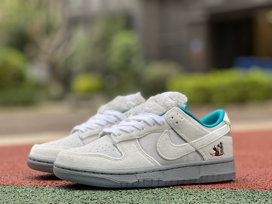 The Dunk Low is based on satin-like silver, with a velvet overlay on the snow and Swoosh. There are various embroidery on the entire upper, including the sleigh on the heel, the child slipping on the toe box, and A man in traditional Chinese clothes is holding a red flag.