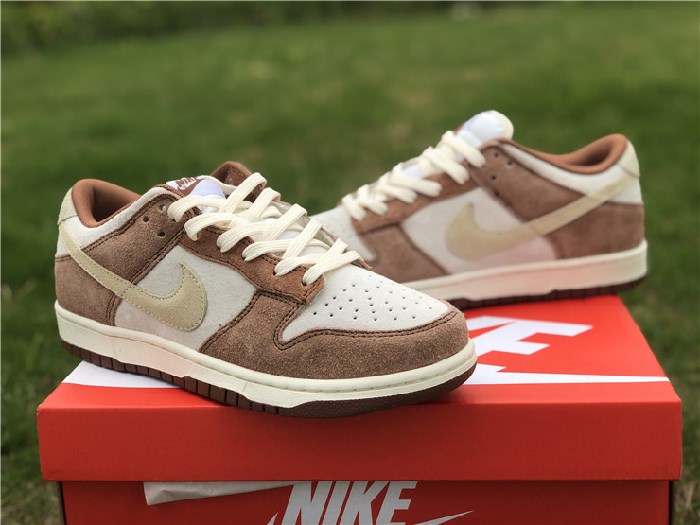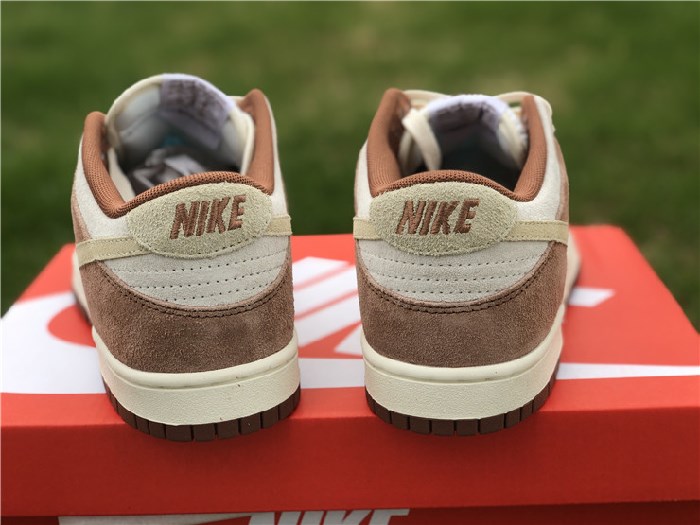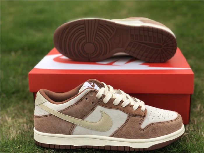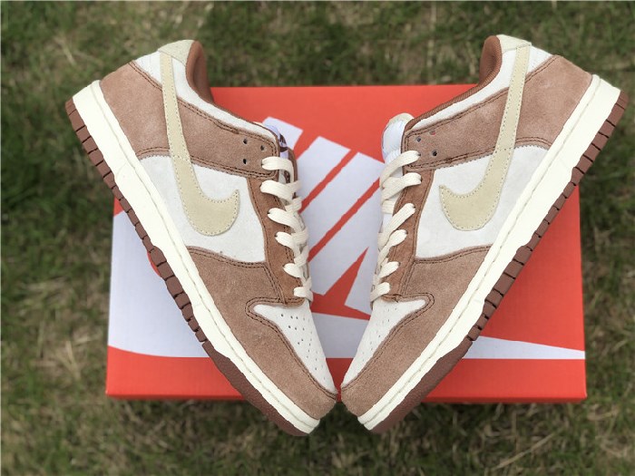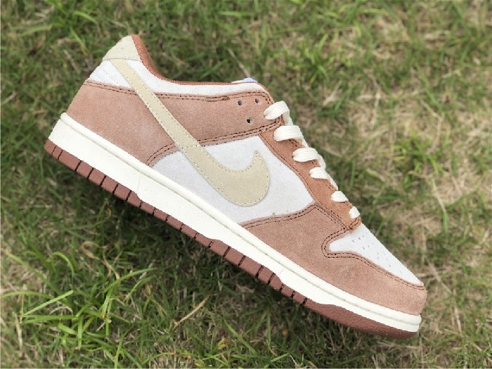 Nike Nike SB Dunk Low PRM Medium Curry Mocha low-top skate shoes. The shoe is framed with a light brown body, with a full suede upper, supplemented by an off-white midsole, and a light brown outsole, somewhat resembling a brown-red Dunk. With beige Swoosh Logo on the side, the brown part of these shoes is closer to light khaki. Brown suede covers the body of the shoe, and the beige fills the upper.