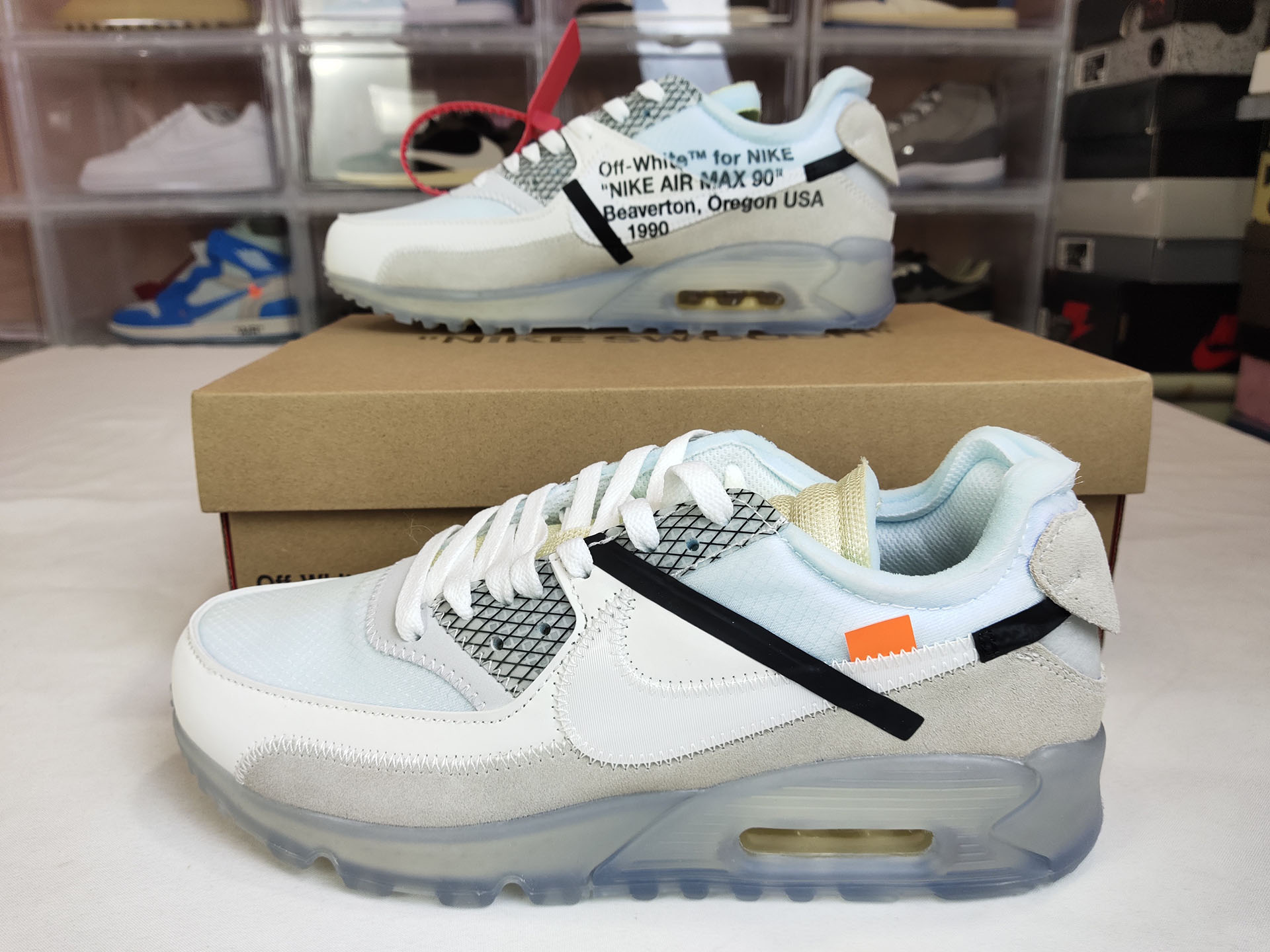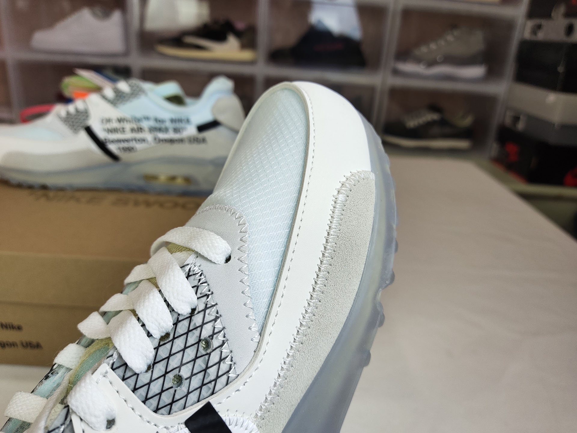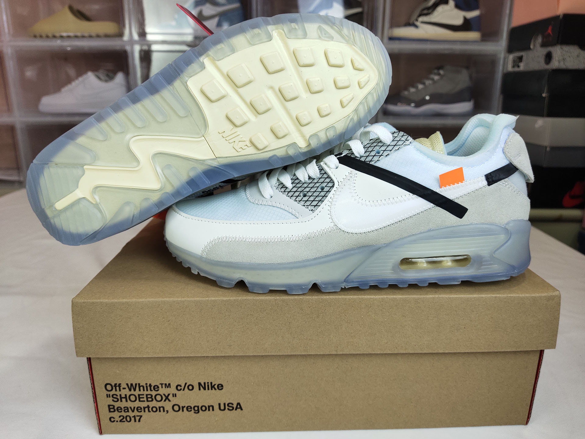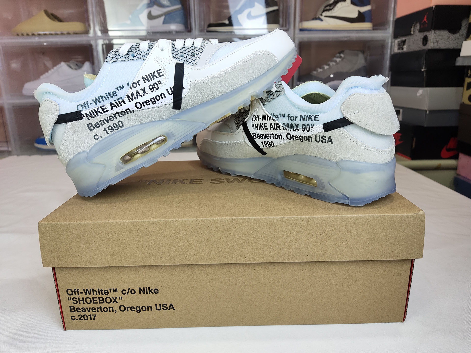 OFF-WHITE x Nike Air Max 90, in addition to the highly recognizable printed text and enlarged side Swoosh, the tongue logo and the black ramp on the shoe also create a very personal playful performance! Supplemented with a light blue crystal outsole at the end, different from the retro style of OG, it shows the uninhibited trend of temperament!
