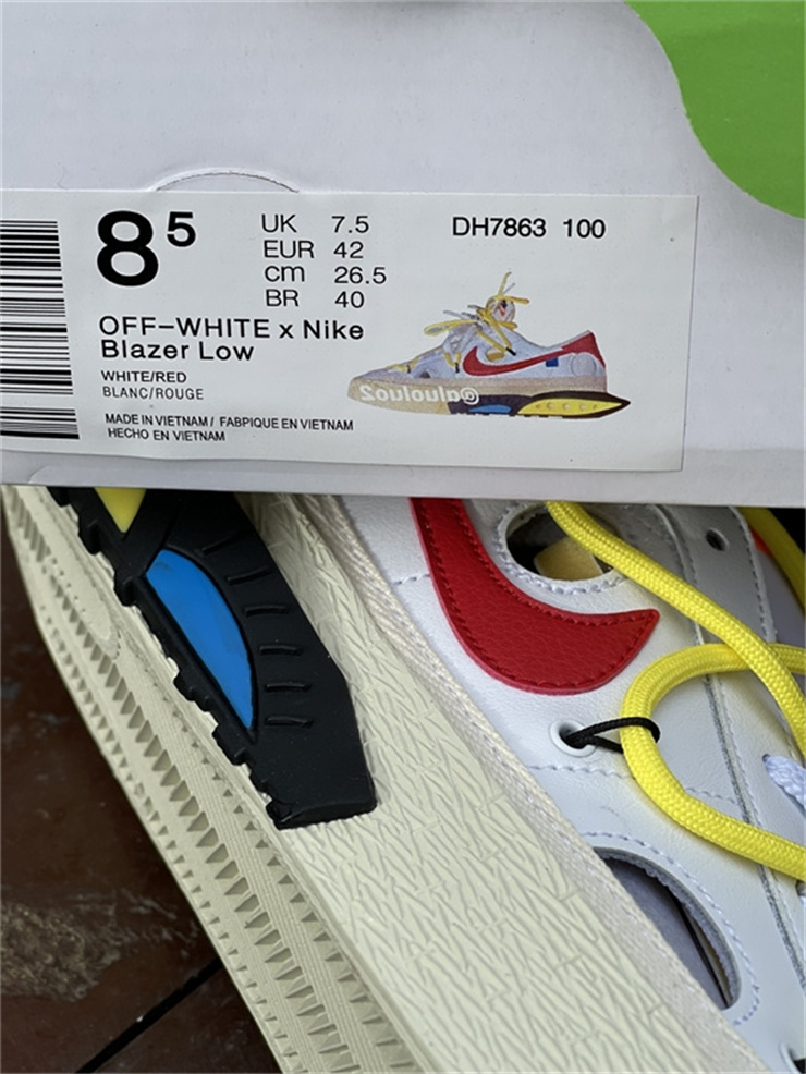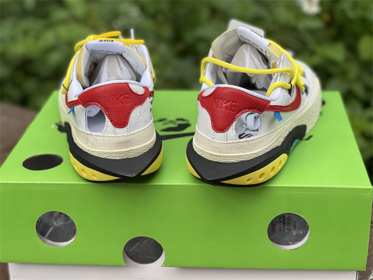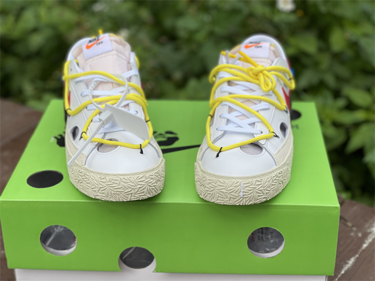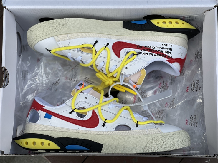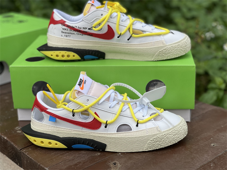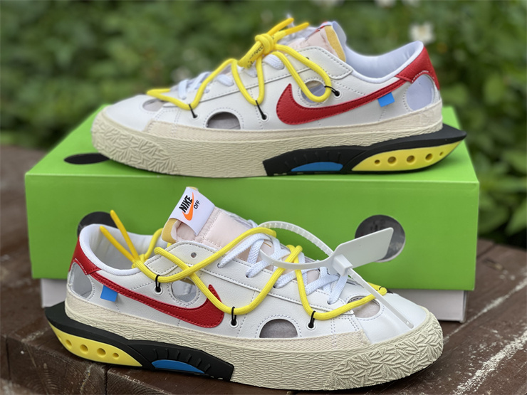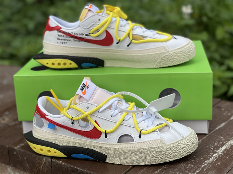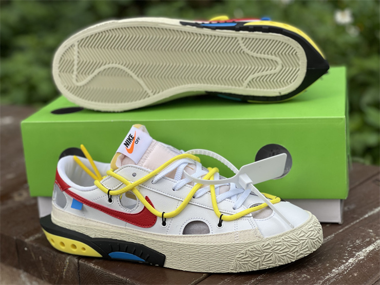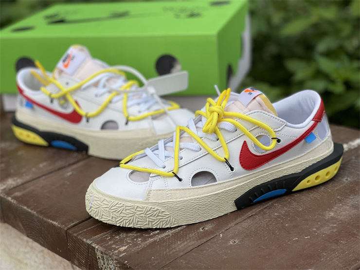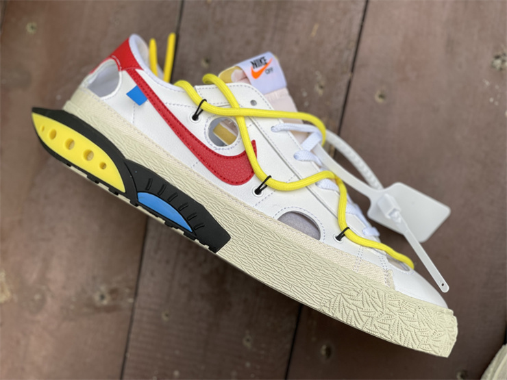 White leather shoe body with red lychee leather Swoosh, fluorescent yellow shoe rope decoration, refreshing simple and bright. The black font on the inside of the shoe body and the design of multiple round holes create a strong deconstruction style. Light yellow used as an old midsole to avoid oxidation troubles. The heel of the outsole is equipped with two irregular prismatic modules, one blue and one yellow, which is very unique.