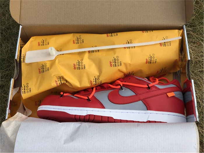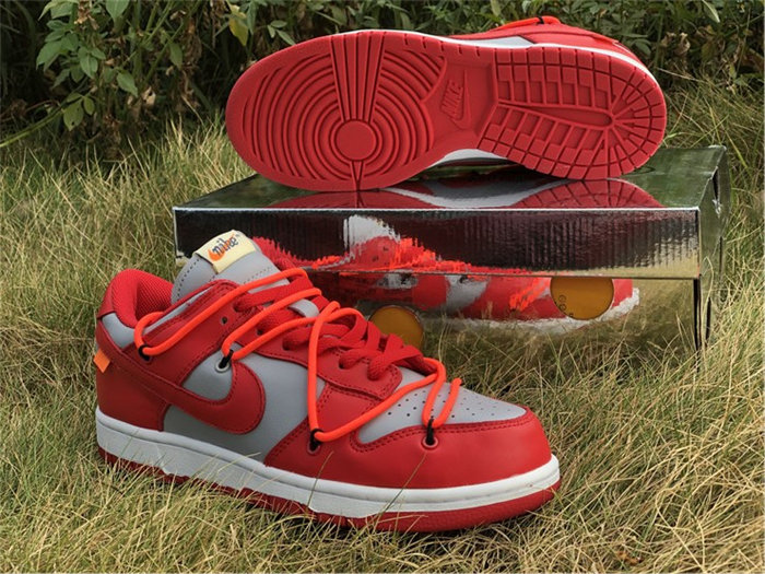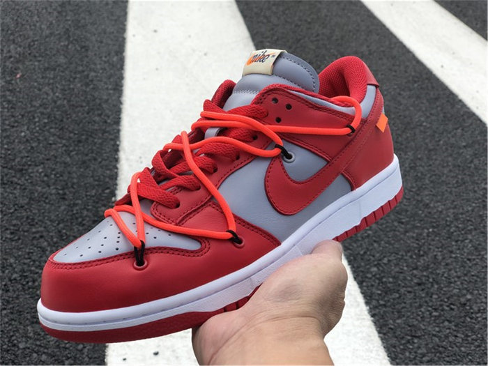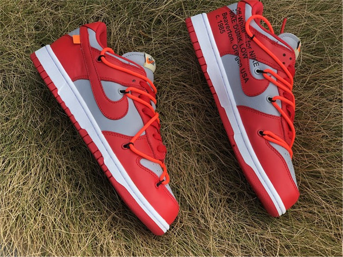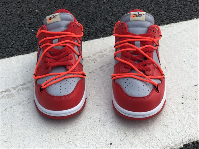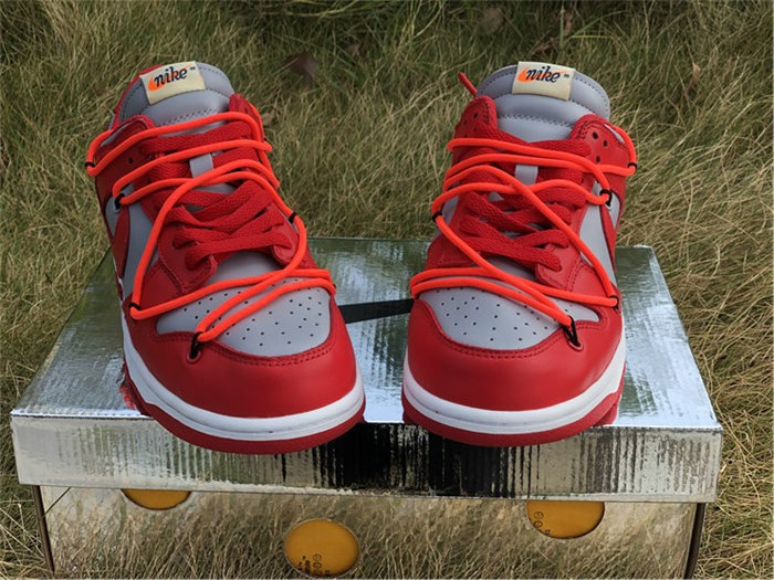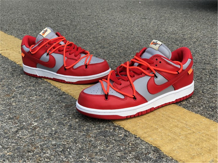 This iteration in University Red and grey leather has retro branding hits, a blown-up text graphic on the medial and a signature flagged Swoosh to the lateral side. Abloh expresses his deconstructivist style with exposed tongue foam, a floating heel tab and secondary lacing. The sneaker comes with a duo-toned rubber cupsole.
