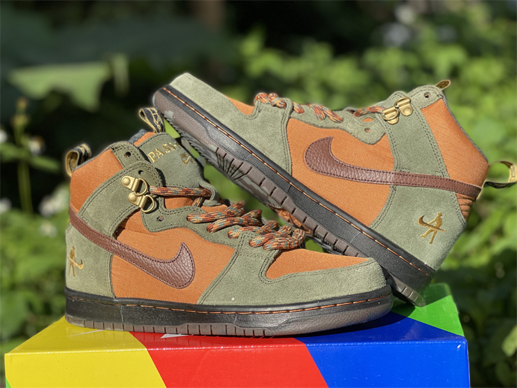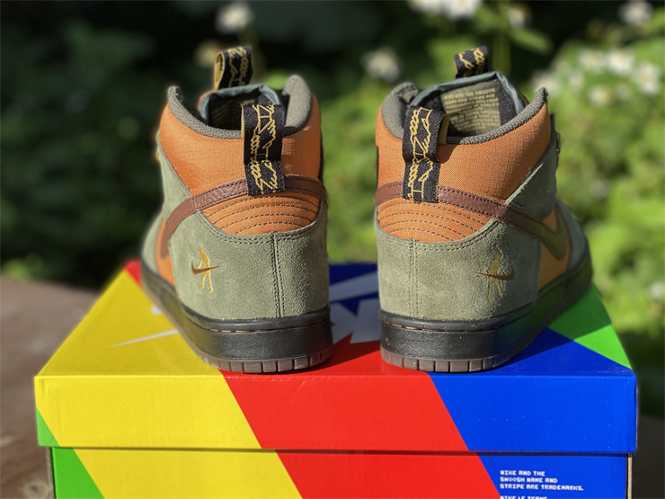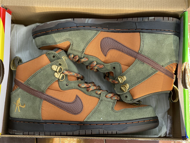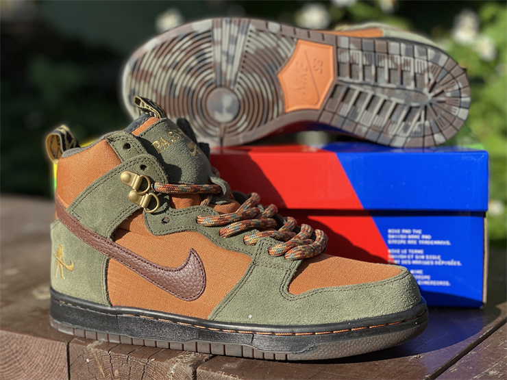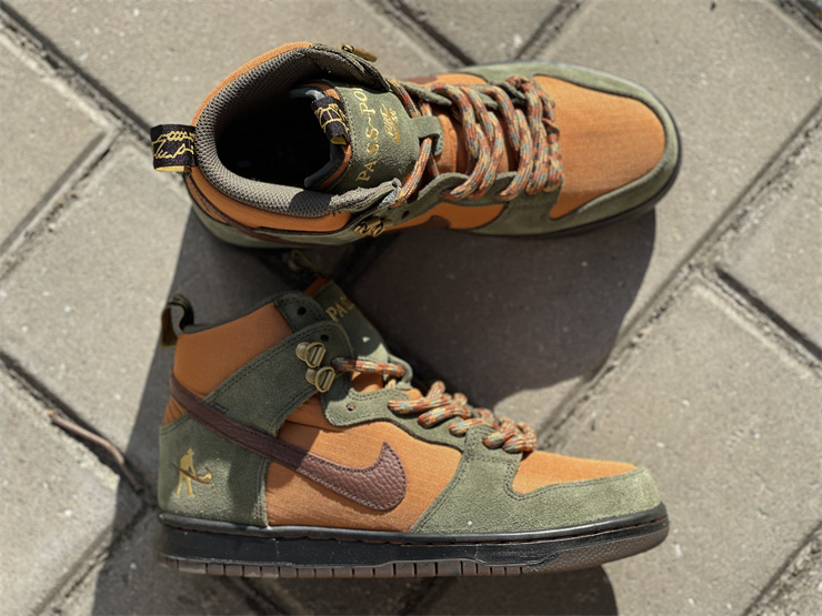Australia's Pass~Port and Nike SB teamed up to design their own special edition SB Dunk High. Reminiscent of hiking boots, this Nike SB Dunk High is made of durable nylon and plush suede materials. The green and golden brown upper is paired with dark brown knurled leather Swooshes.