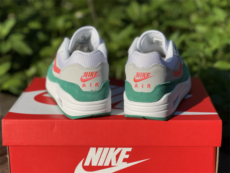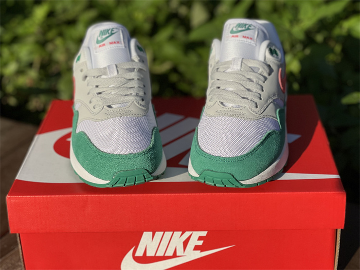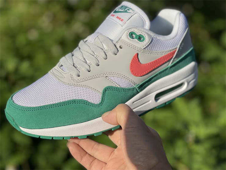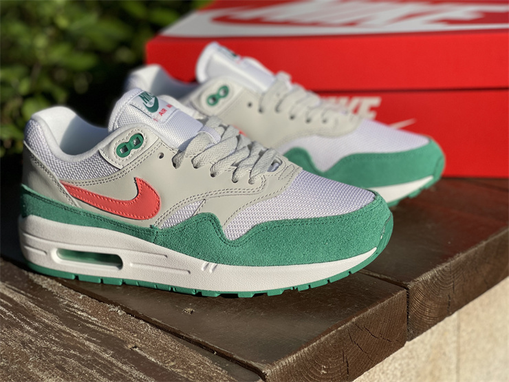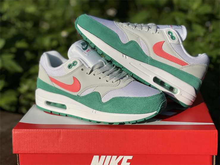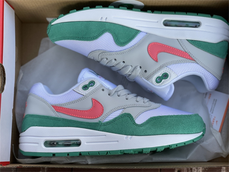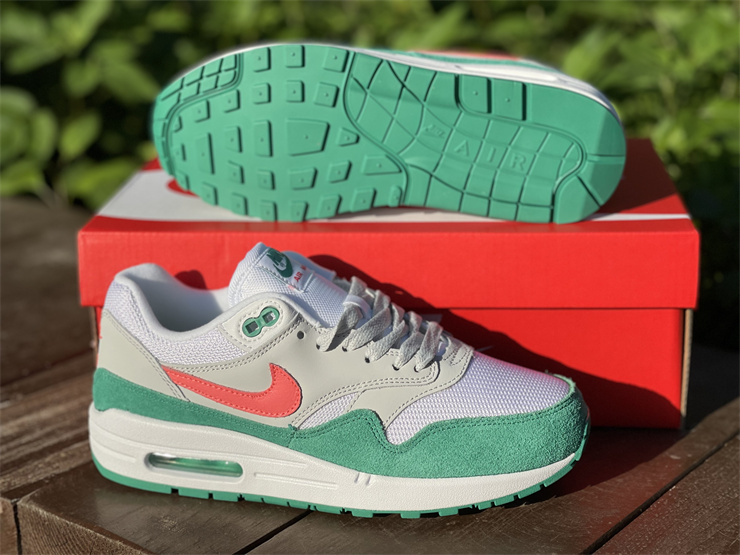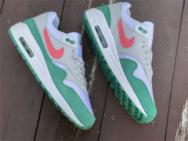 Nike Air Max 1 "Watermelon" Watermelon Red Men's Casual Air Cushion Running Shoes The upper is made of suede, leather and mesh cloth materials. The white mesh cloth and gray leather are simple and clean. Swoosh on the side and embroidered at the tail Nike Logo, etc. are all presented in bright pink, with green elements on the body and sole of the shoe, and the fragrance of sweet watermelon.