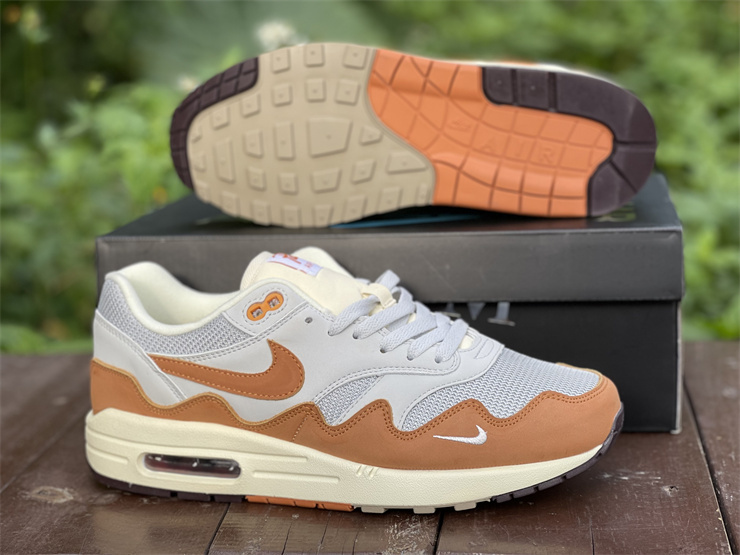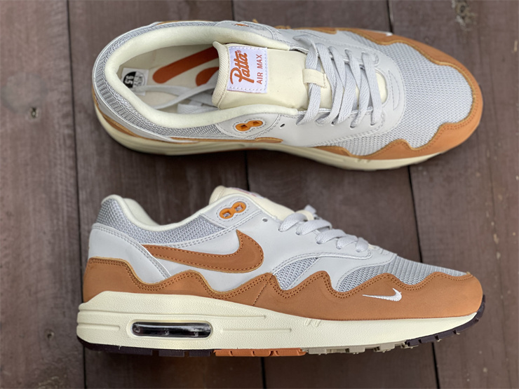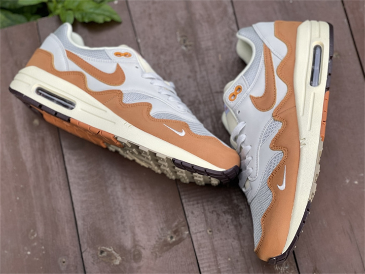The upper is crafted from light grey ballistic mesh with white leather overlays and an orange suede Swoosh. The autumnal hue is repeated on a wavy suede mudguard, accented with an embroidered mini-Swoosh on the lateral forefoot.