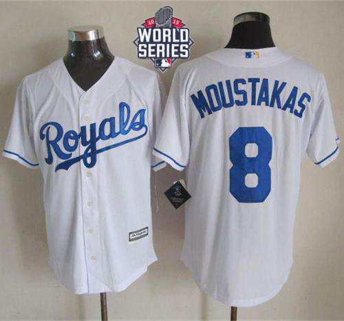 Royals #8 Mike Moustakas White New Cool Base W/2015 World Series Patch Stitched MLB Jersey
