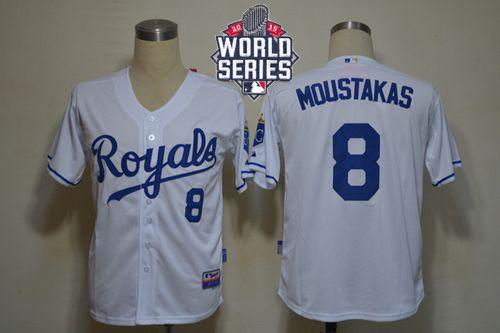 Royals #8 Mike Moustakas White Cool Base W/2015 World Series Patch Stitched MLB Jersey