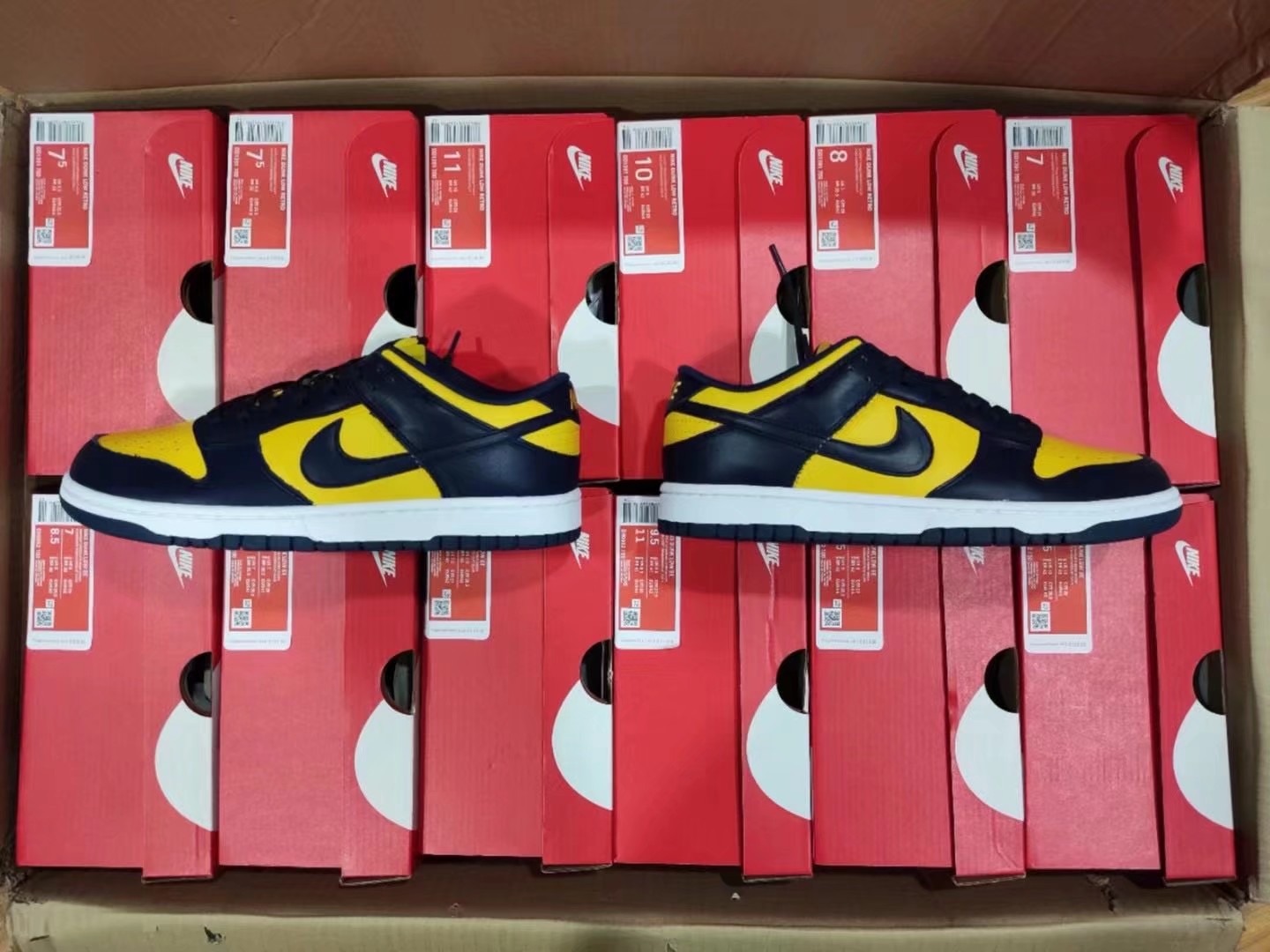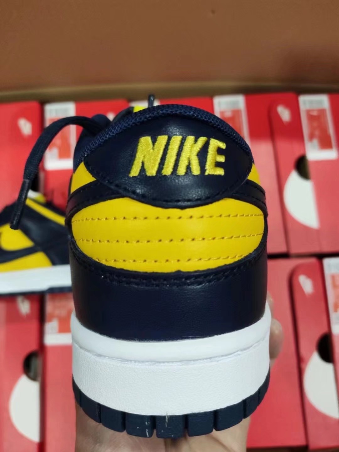 The frame of the shoe is crafted in dark navy blue, and the rest of the shoe is filled with yellow for a classic University of Michigan-themed colorway. Complete the design with a white midsole and navy blue outsole.