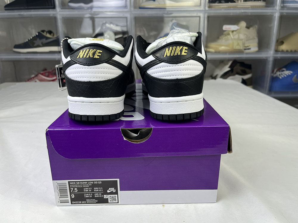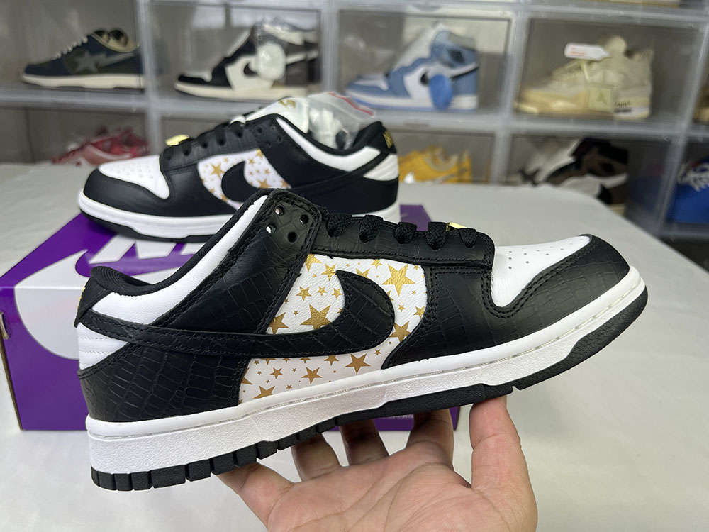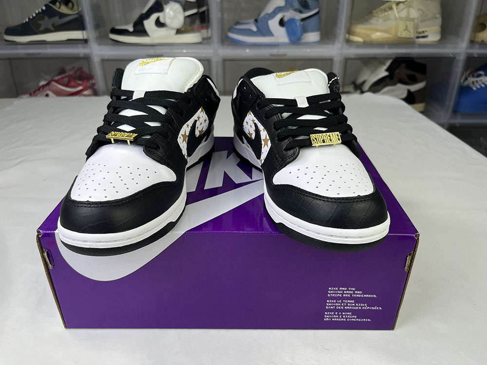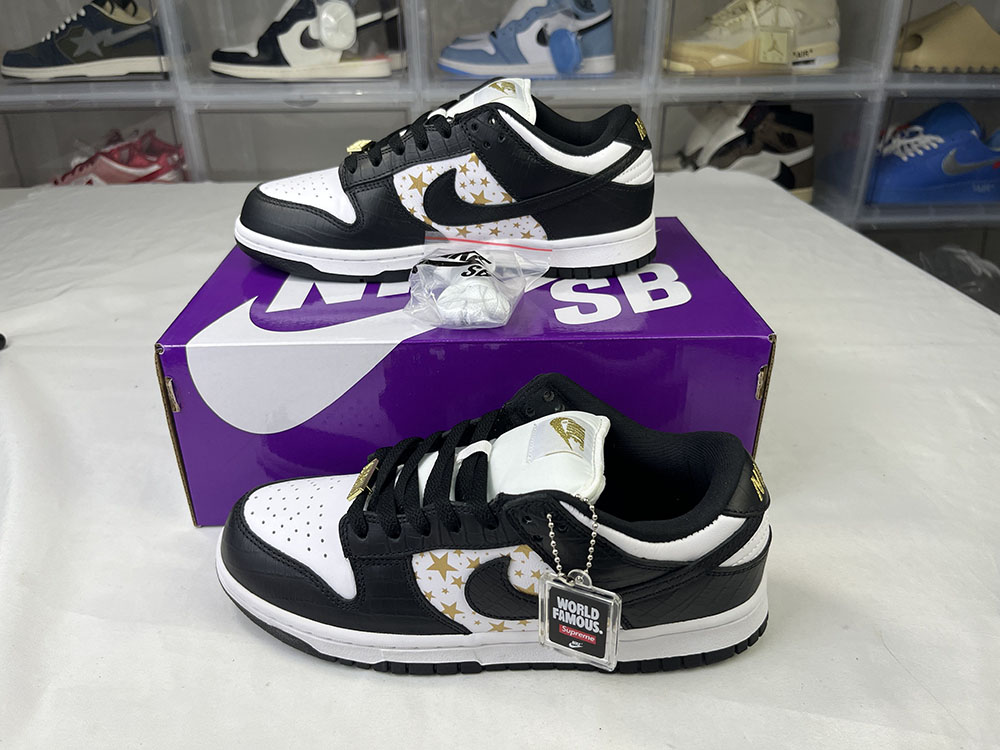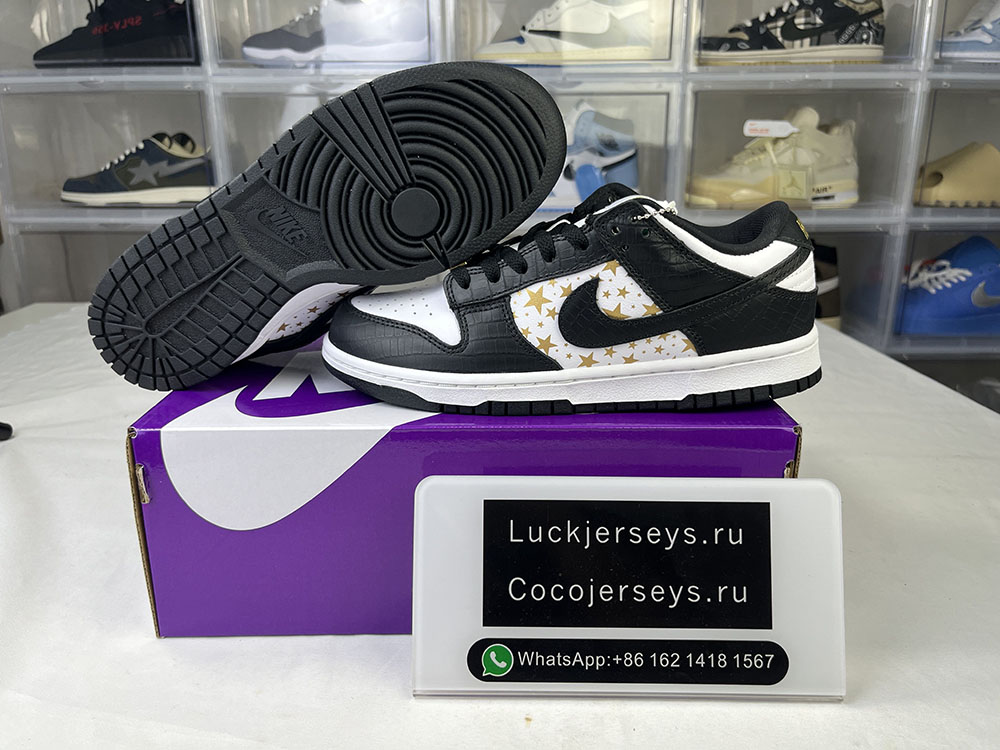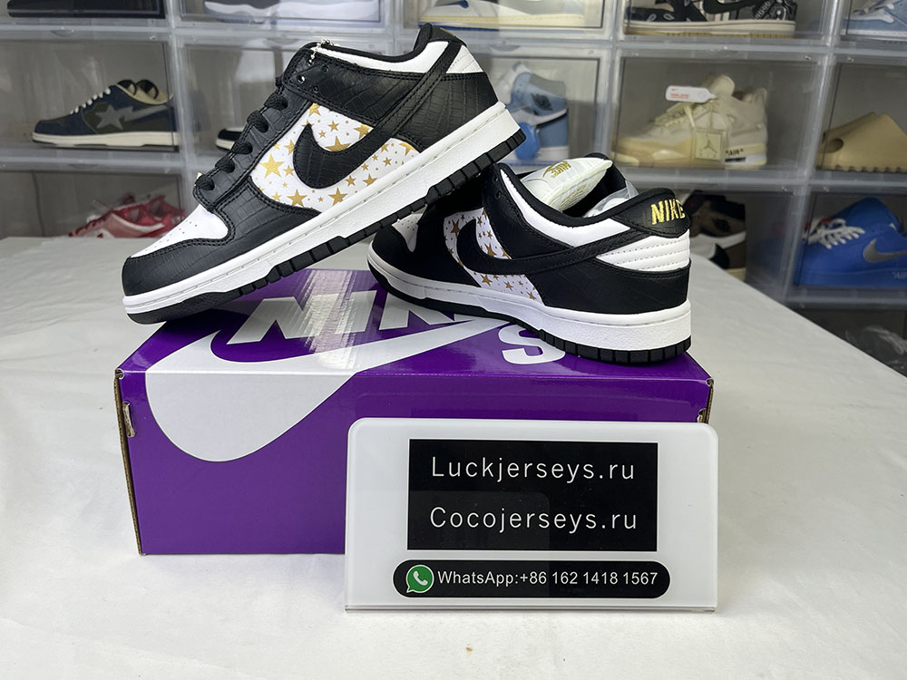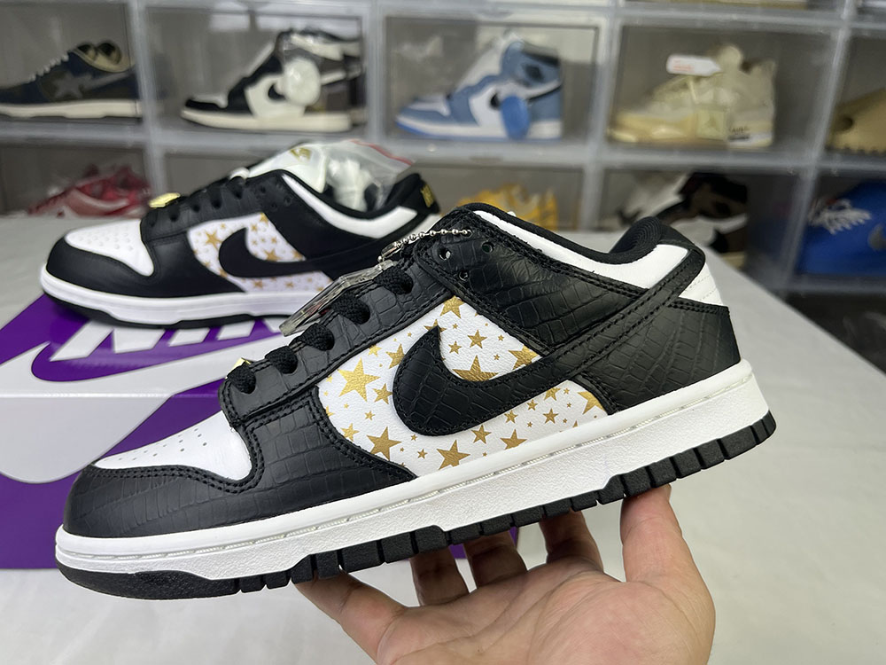 Collaboration Su*preme x SB Dunk Low black and white star gold sneakers. The gold lace buckle is displayed with the word Supreme, a nod to the sneaker's predecessors. The crocodile textured upper is combined with a low-key combination of black, white and gold, and the shoe body is the same as the Supreme x Dunk Hi. The classic red and white Supreme on the insole is co-branded with gold stars on the side of the shoe.