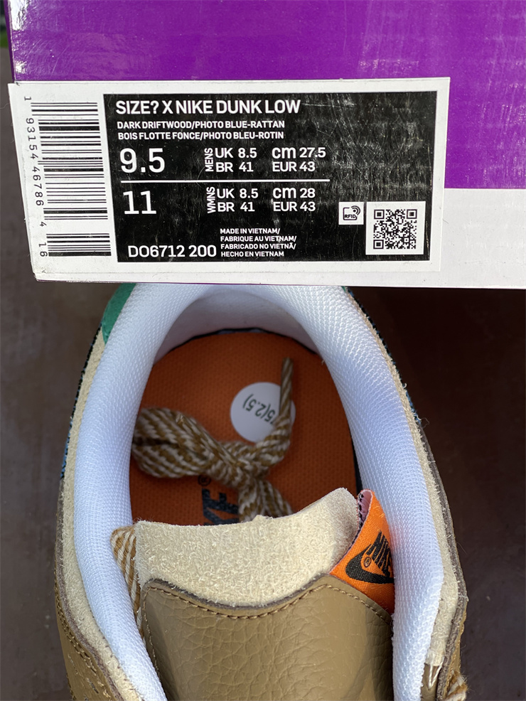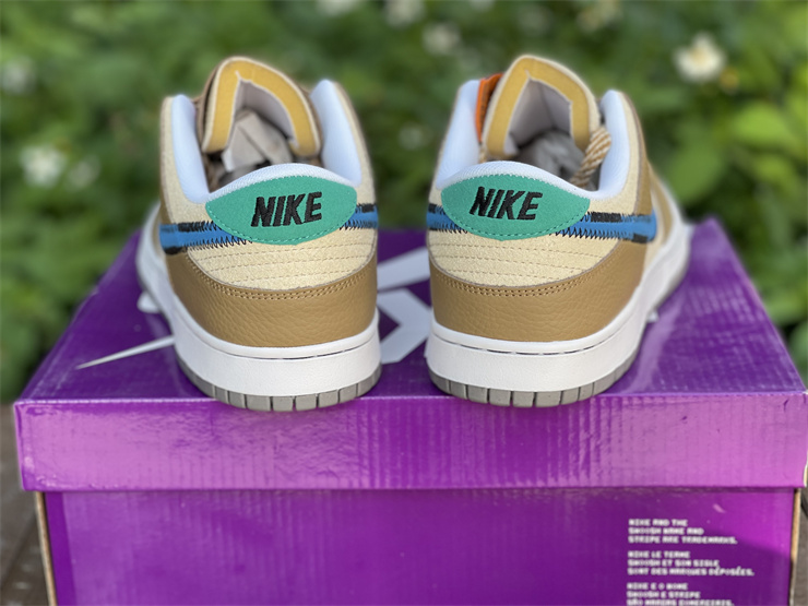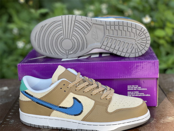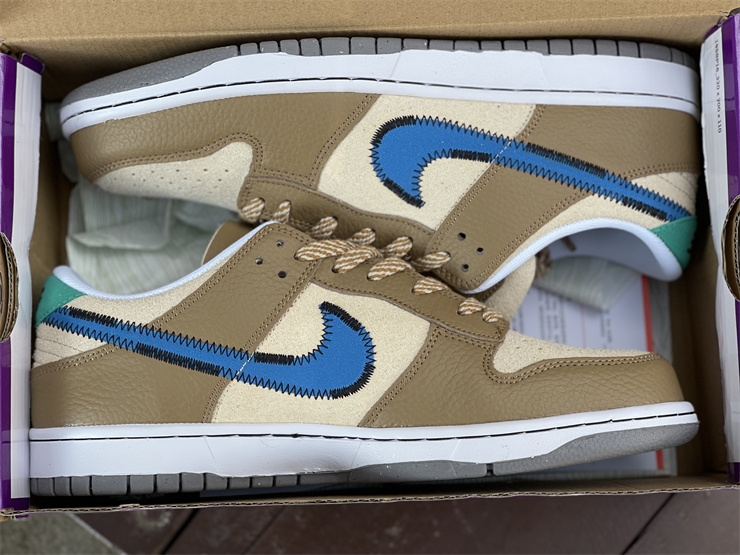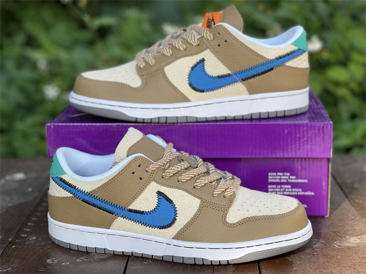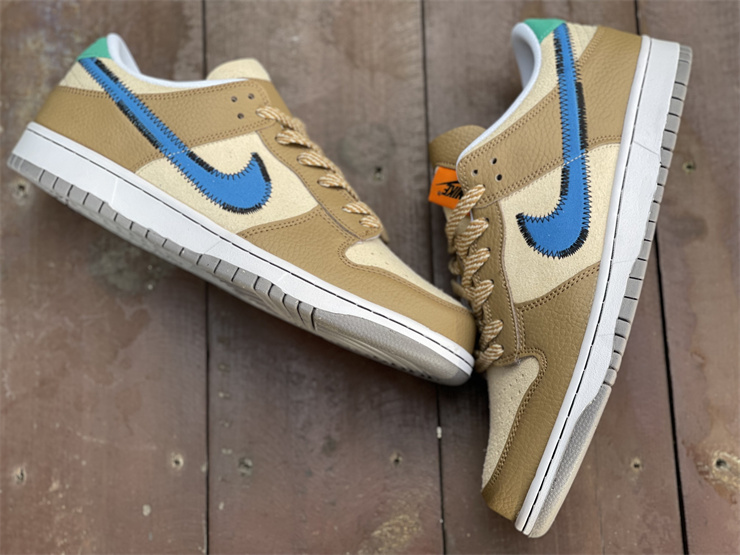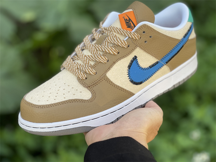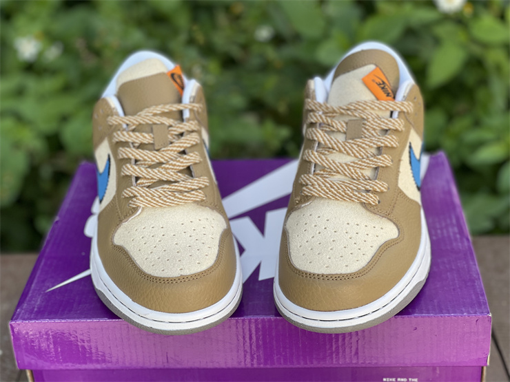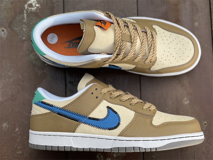 This shoe is made of brown leather and suede, with blue Swoosh logo on both sides, and black stitching to outline the outline. The orange Nike label on the tongue is designed in reverse orientation.
