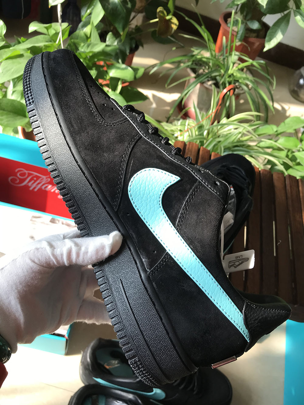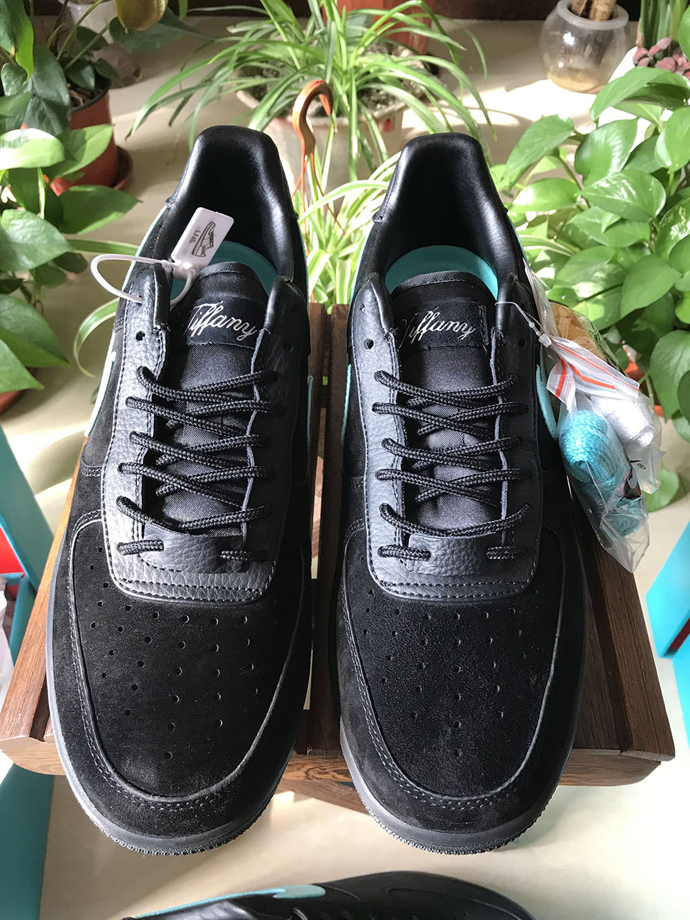 The LACES are not sports LACES but the thick rope LACES common on Tiffany And Co bag string and bag handles, in a black aqua and chrome tint that looks just like Dunk drops. The similarities are attributed to the color of the jewelry, the chrome-plated applique on the heel and the etched tongue tag.