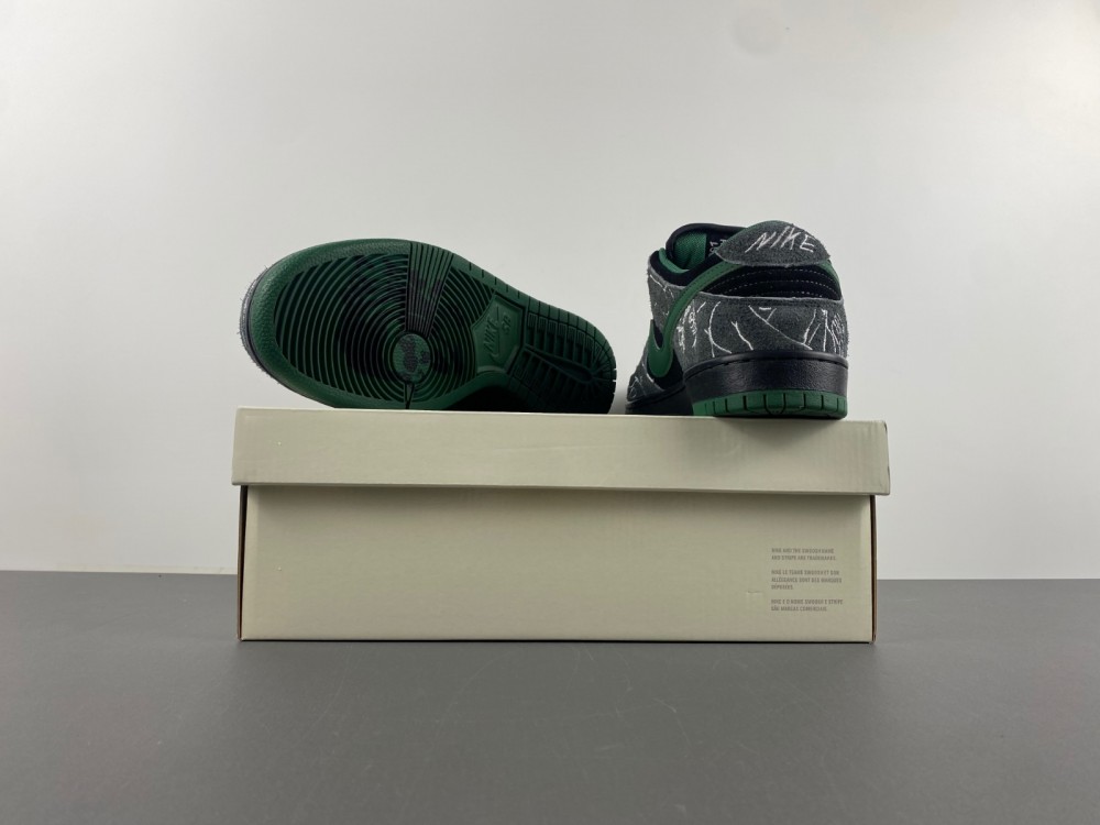 The whole shoe uses black as the base color and green is used to embellish the sides of the shoe body. The surrounding outline is supplemented with white graffiti lines to enrich the upper elements and enhance the visual level. The Nike SB words are rendered in the same way on the Nike Tag part of the tongue to echo.