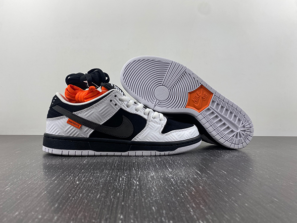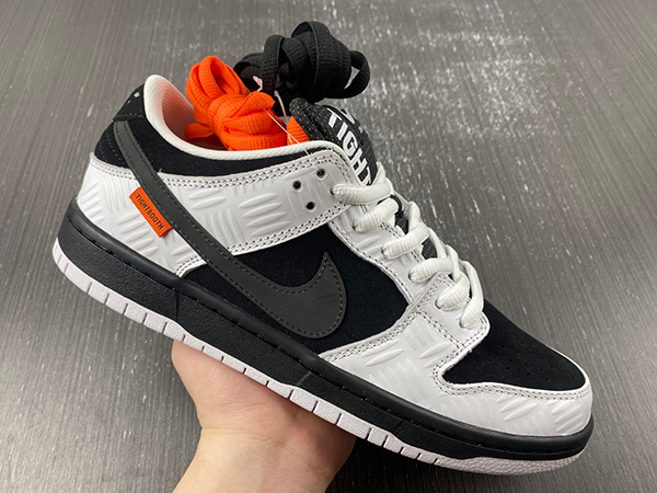 Upper with embossed scratch lines, white leather frame. Shoe material is suede sole, tongue label side with "TIGHTBOOTH". The tongue part of the shoe is dotted with white dots, and the body is in black and white tones. The tail is embellished with orange TIGHTBOOTH, while Swoosh uses black.