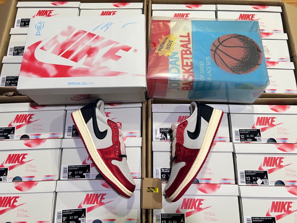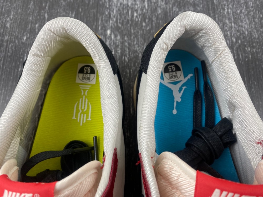 The Swoosh on the top of the shoebox was faded and the lining paper was designed using Jordan's 1986 Fler Basketball rookie card color scheme.