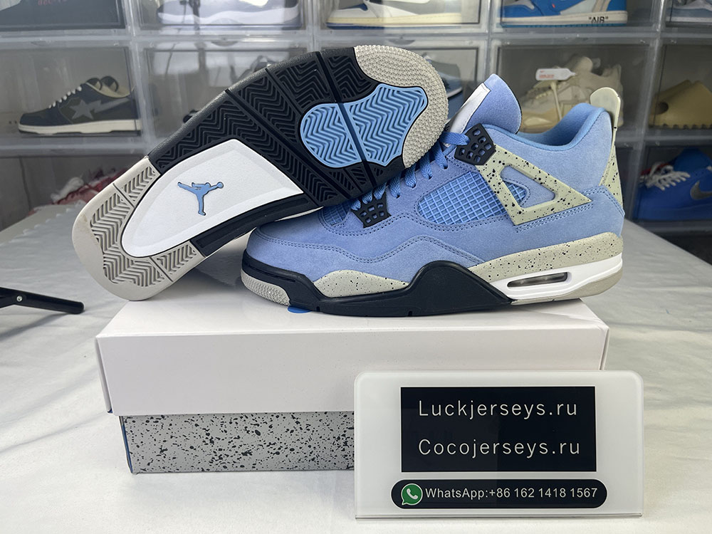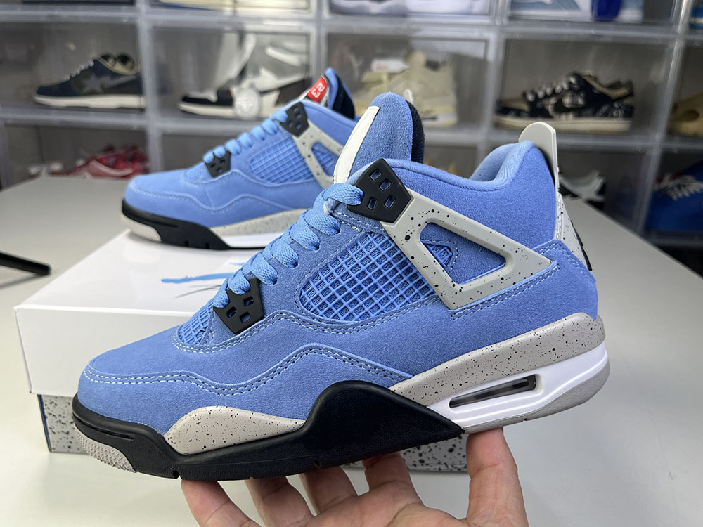 Features a color combination of college blue, tech gray, white, and black, while the same shade falls on the mesh, background, and tongue of the shoe. The cement print falls on the wing, heel and part of the midsole, which is also black and white.