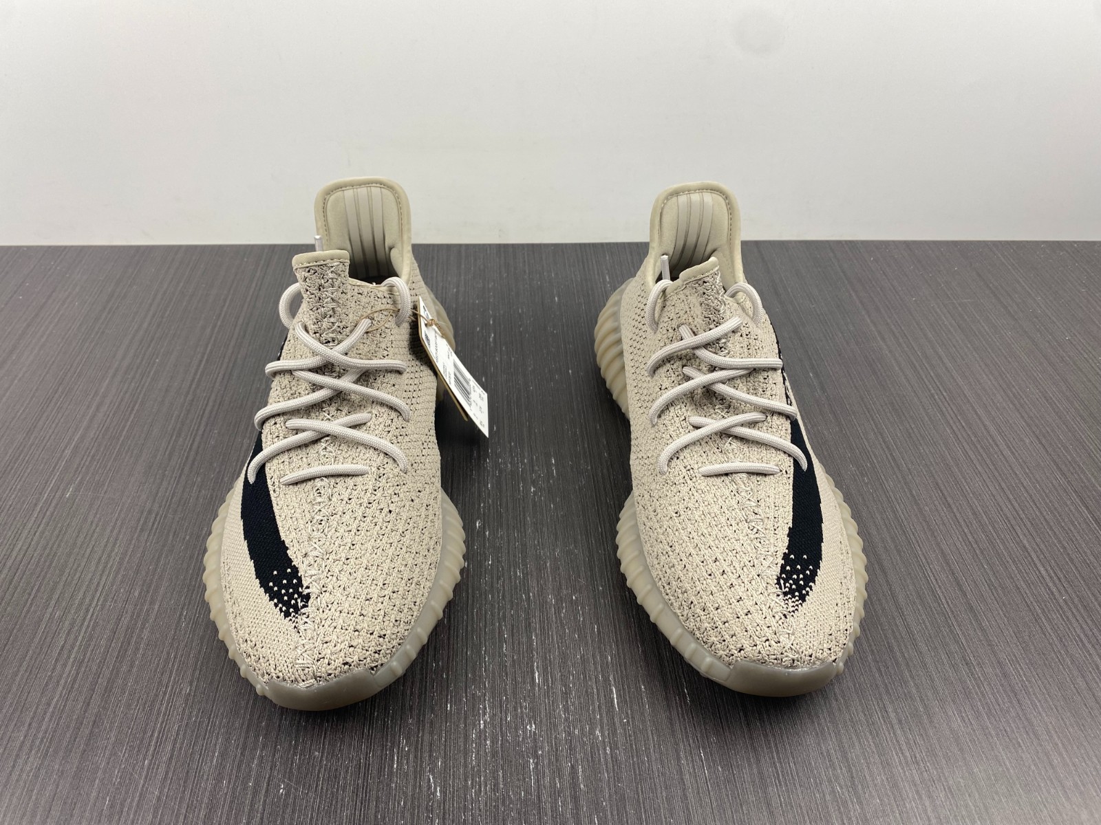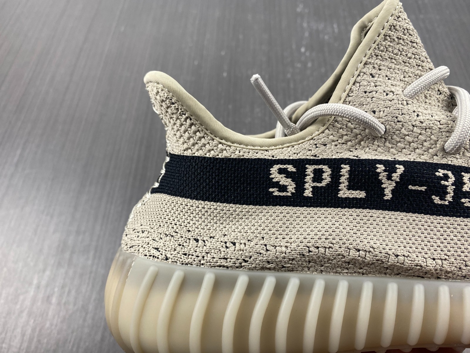 This Y*eezy Boost 350 V2 features a Primeknit upper in a beige tone with black SPLY-350 stripes on the sides. Translucent Boost cushioning completes the design.