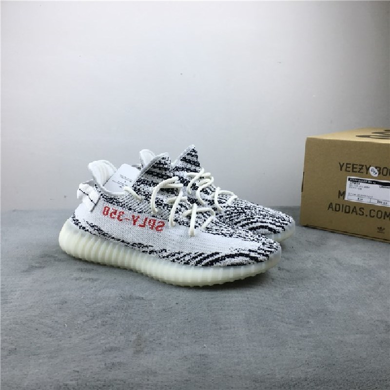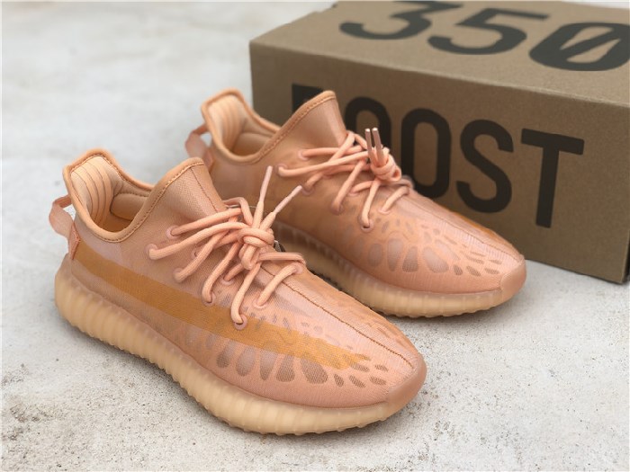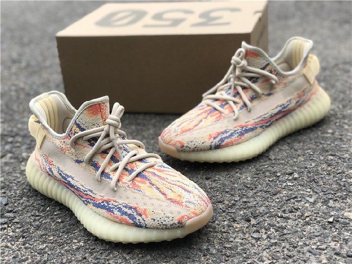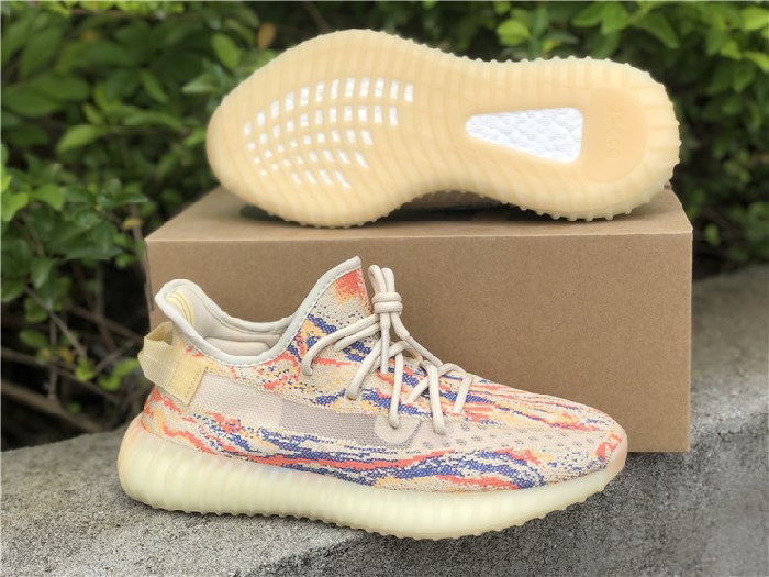 This adidas Yeezy Boost 350 V2 features a cream-yellow Primeknit upper covered in a swirl pattern in shades of orange, blue and gold.
