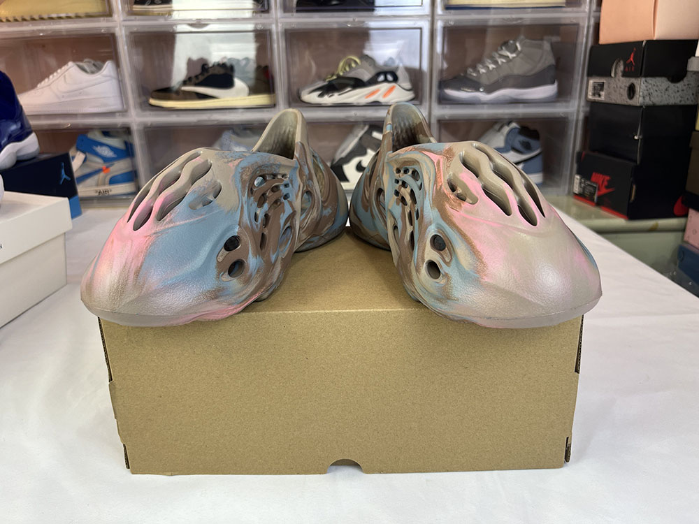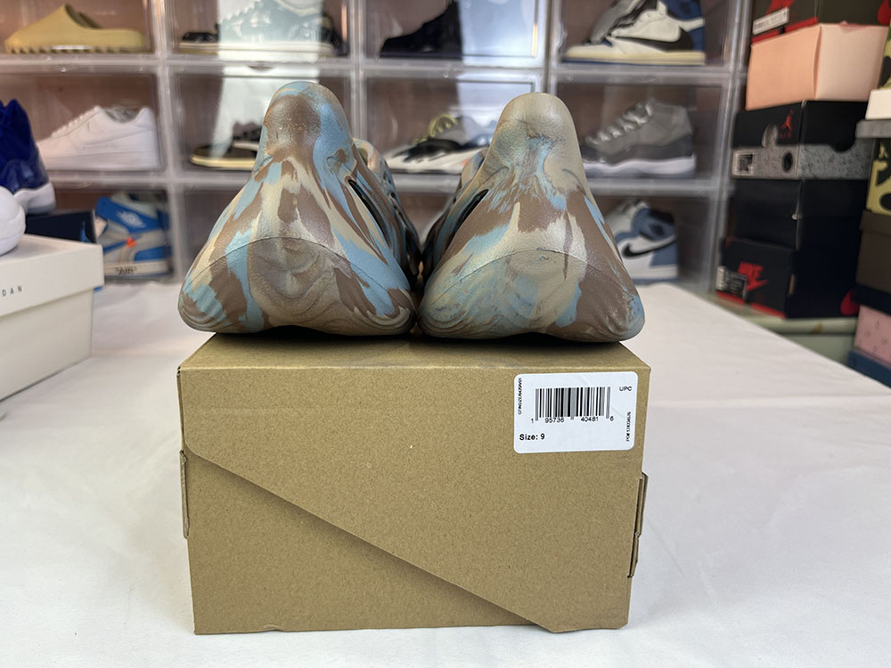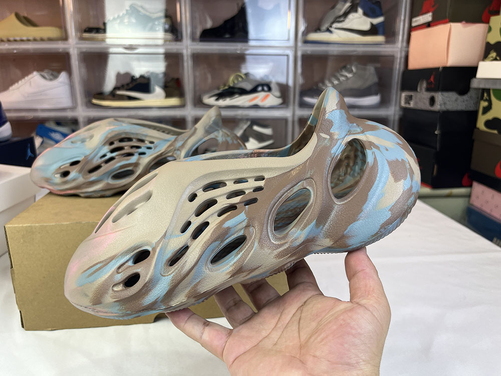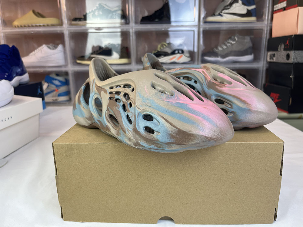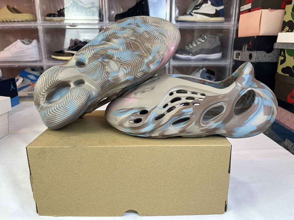 The new color matching Yeezy Foam Runner, this time in addition to the classic earth color system, incorporates the "ice blue" color matching, and the mixing effect is quite eye-catching. The entire design is covered in marble and the color combination has a tie-dye effect. The bottom is a combination of sand and brown, embellished with blue throughout the upper, and the visual effect is particularly eye-catching.